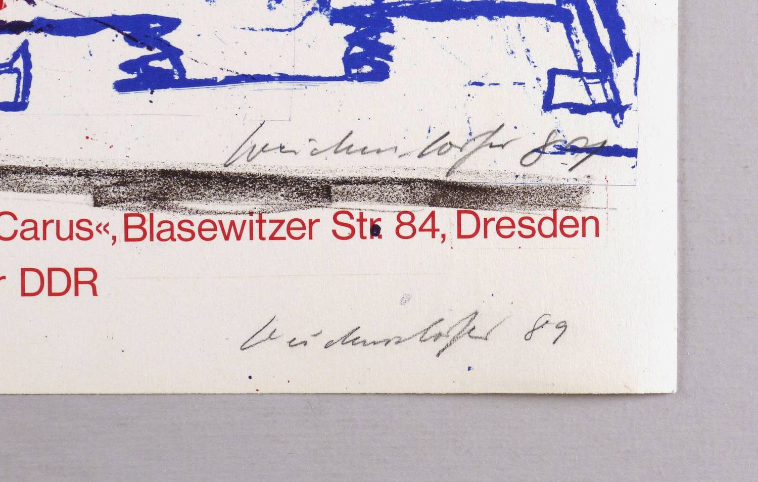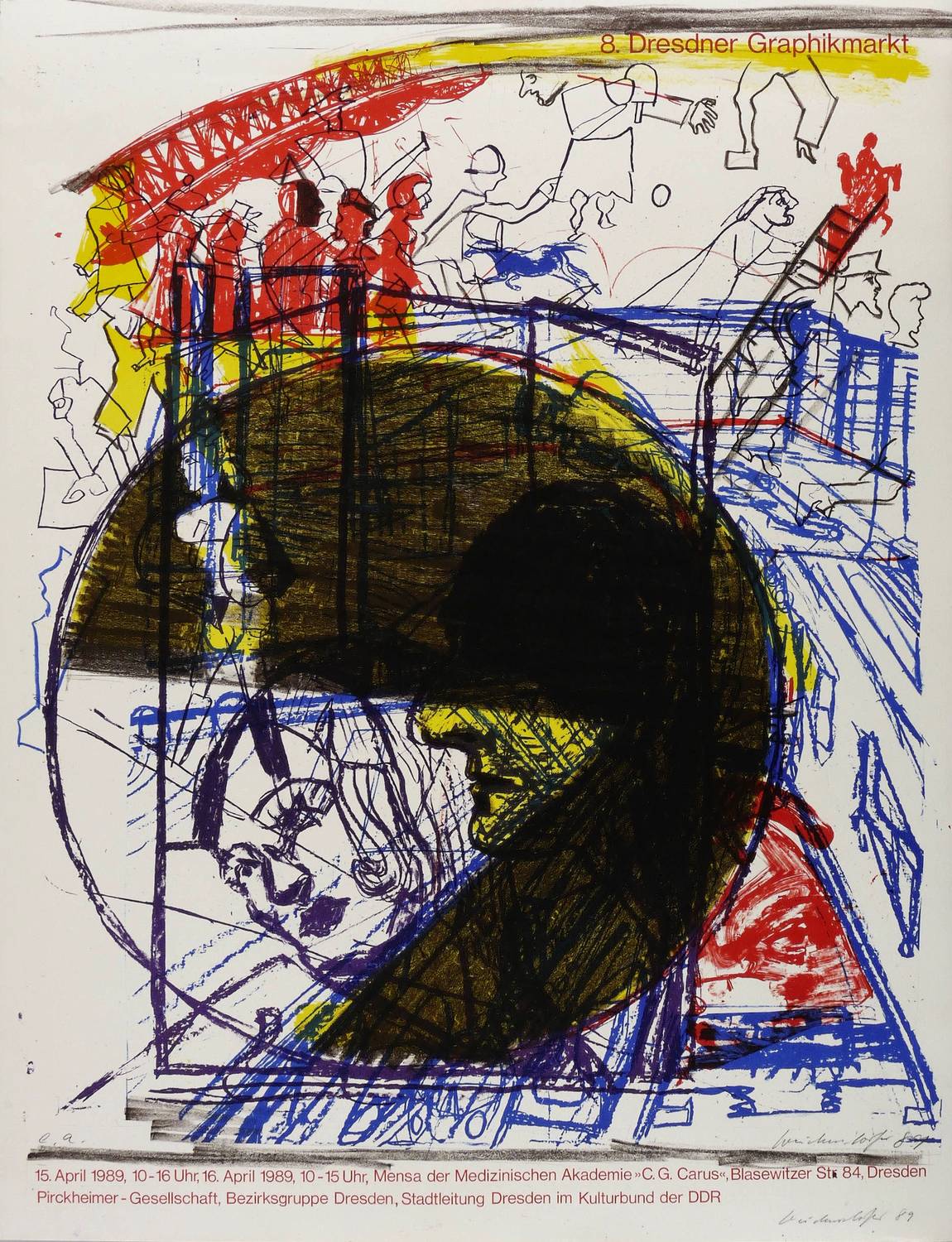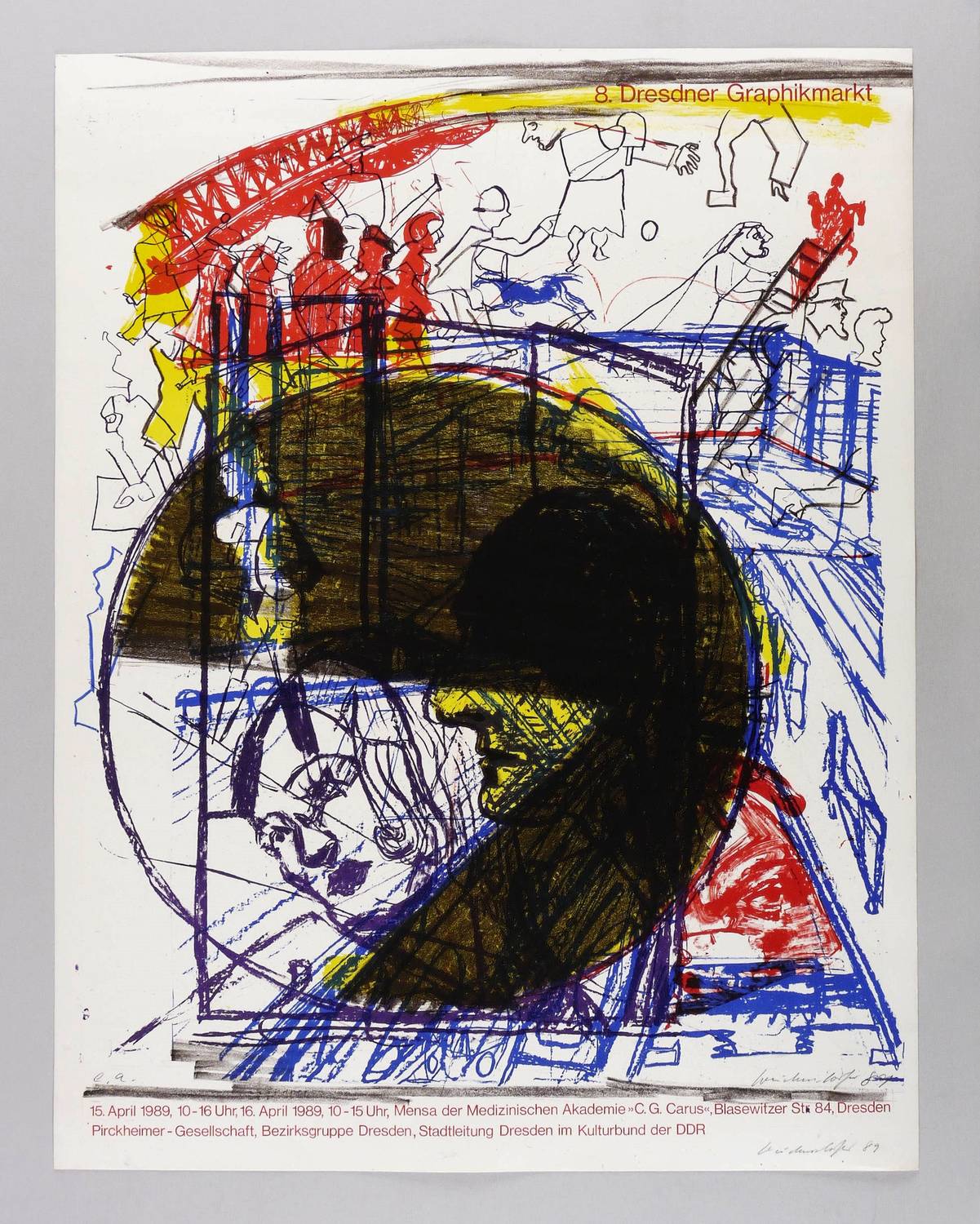 Muschter 654 a. – In Bleistift rechts unten zweimal signiert und datiert: ″Weidensdorfer 89″. Links Auflagenbezeichnung. – Originalgrafisches Künstlerplakat zum 8. Dresdner Graphikmarkt am 25. April 1989 in der Mensa der Medizinischen Akademie C.G. Carus in Dresden. – Sehr guter Zustand.