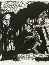 Muschter 506. – In Bleistift rechts unten signiert und datiert: ″Weidensdorfer 85″. Links Auflagenbezeichnung: ″00/33″. Mittig Widmung. Im Stein oben diverse Inschriften. Wasserzeichen der Hahnemühle. – Originalgrafisches Künstlerplakat zur Ausstellung ″Claus Weidensdorfer. Grafik″ 23.3.-10.5.1985 im Kunstkabinett in Erfurt. – Oben und seitlich randloser Druck. – Blattrand links unten mit hinterlegter Partie. Mäßig guter Zustand.