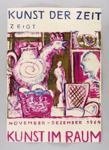 In Bleistift rechts unten signiert und datiert: ″Claus Weidensdorfer 64″. Im Stein diverse Inschriften. – Nicht bei Muschter. – Originalgrafisches Künstlerplakat zur Ausstellung ″Kunst im Raum″ in der Galerie Kunst der Zeit in Dresden 1964. – Druck von Elly Schreiter. – Provenienz: Michael Wackwitz, Steindrucker in Dresden und Stuttgart. – Randloser Druck. – Tadellos. Sehr guter Zustand.