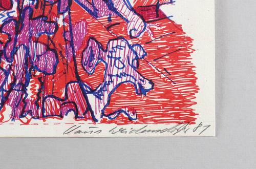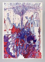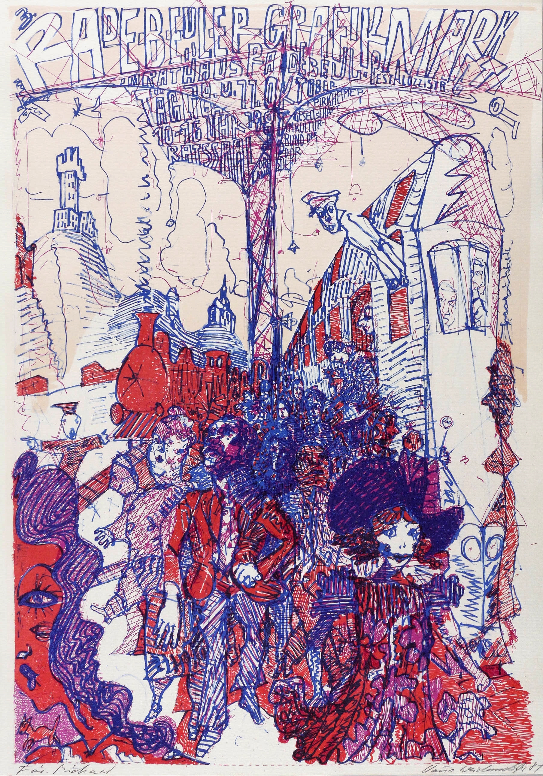 1981. Farblithografie / Kreide- & Pinsellithografie, in Hellrot, Rot, Violett & Dunkelblau, auf hellchamois Weißenborn. – Originales Künstlerplakat, von Claus Weidensdorfer. – Druckerexemplar. – 72 x 51 cm (Blatt), 70,0 x 49,0 cm (Darstellung / Druckbild).