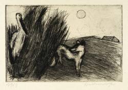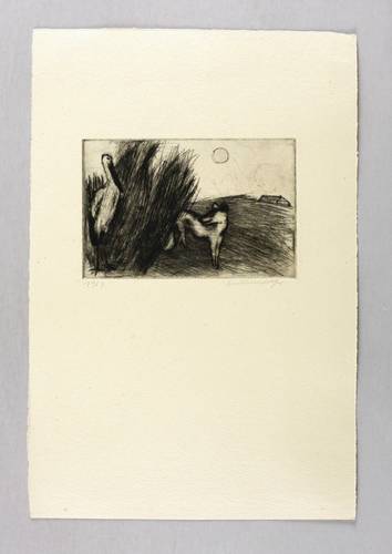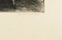 1963. Radierung / Kaltnadel, in Schwarz, auf kräftigem hellchamois Velinkarton. – Originale Künstlergrafik, von Claus Weidensdorfer. – 10,8 x 16,5 cm (Darstellung / Platte), 38 x 26 cm (Blatt).