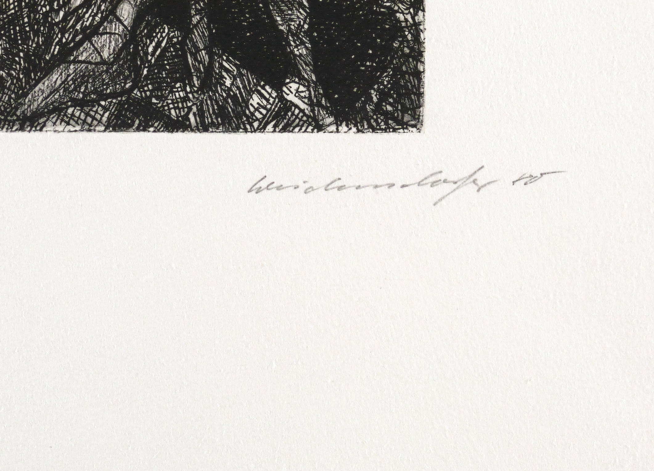 Rechts unten in Bleistift signiert und datiert: ″Weidensdorfer 80″. In der Blattecke links unten Auflagenbezeichnung: ″I/V″. – Nicht bei Muschter. – Es existiert eine vergrößerte Fassung von 1989 in einer Auflage von 40 arabisch nummerierten Exemplaren. – Sehr guter Zustand.