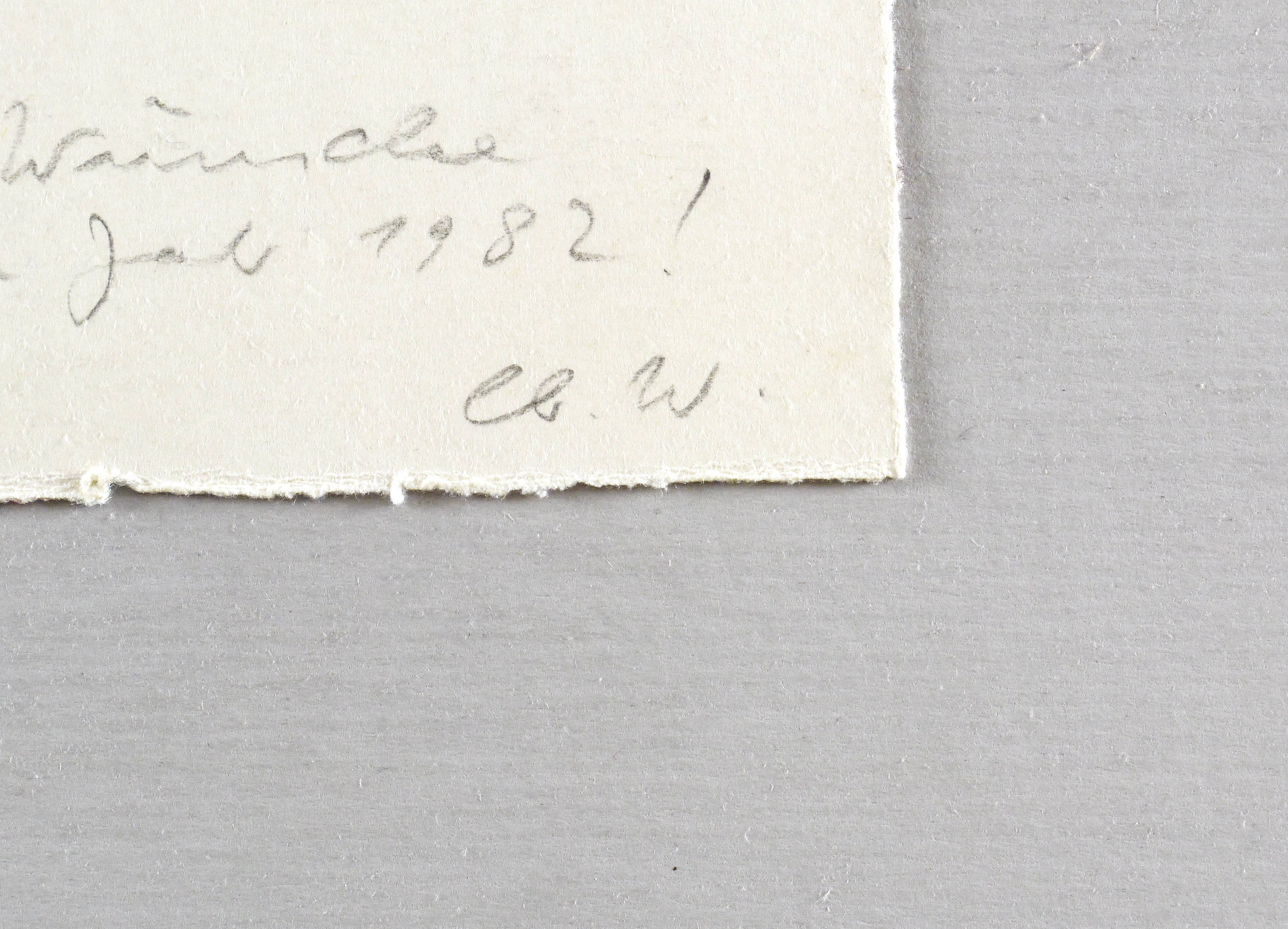 Verso in Bleistift handschriftlicher Gruß des Künstlers an den Drucker Michael Wackwitz: ″Für Michael die allerbesten Wünsche zum Neuen Jahr 1982! Cl. W.″ – Neujahrsgrafik für das Jahr 1982. – Nicht bei Muschter. – Ohne Mängel. Sehr guter Zustand.