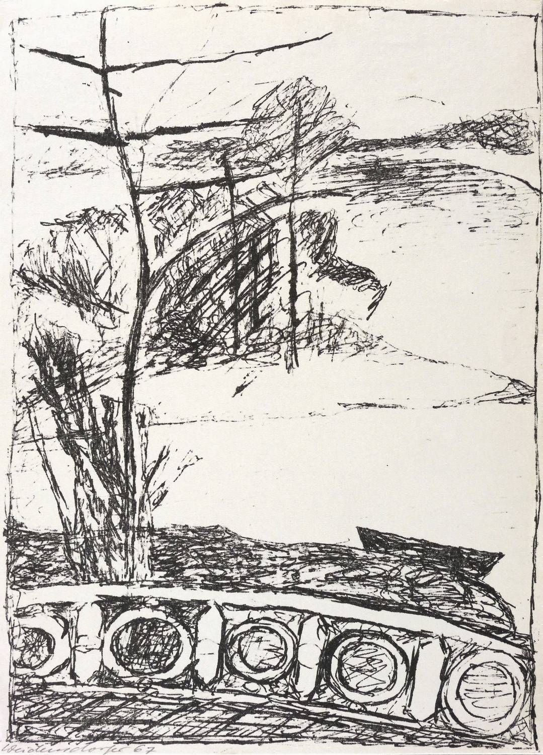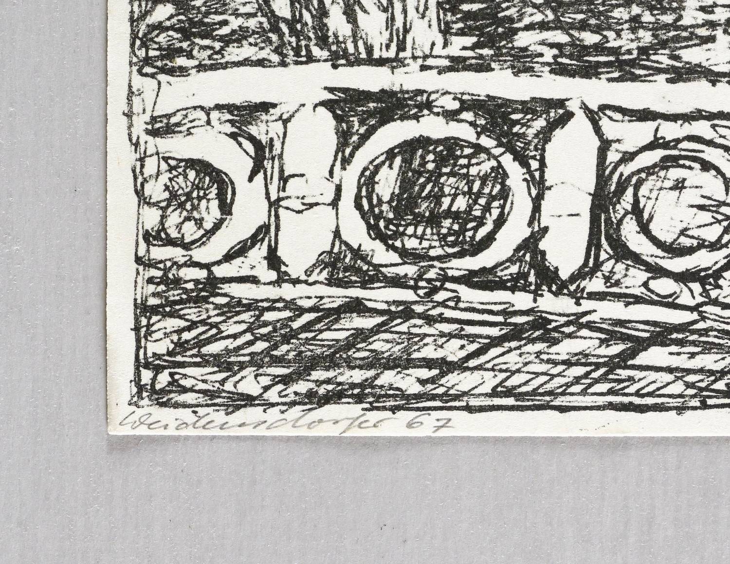 1967. Lithografie / Federlithografie, in Schwarz, auf leichtem hellchamois Velin. – Originale Künstlergrafik, von Claus Weidensdorfer. – 21,3 x 15,6 cm (Darstellung / Druckbild), 22,0 x 15,8 cm (Blatt).