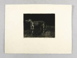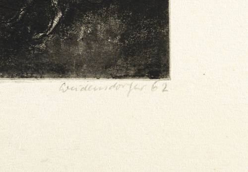 1962. Radierung / Aquatinta & Strichätzung, in Schwarz, auf kräftigem chamois Velinkarton. – Originale Künstlergrafik, von Claus Weidensdorfer. – 9,4 x 12,1 cm (Darstellung / Platte), 19 x 26 cm (Blatt).