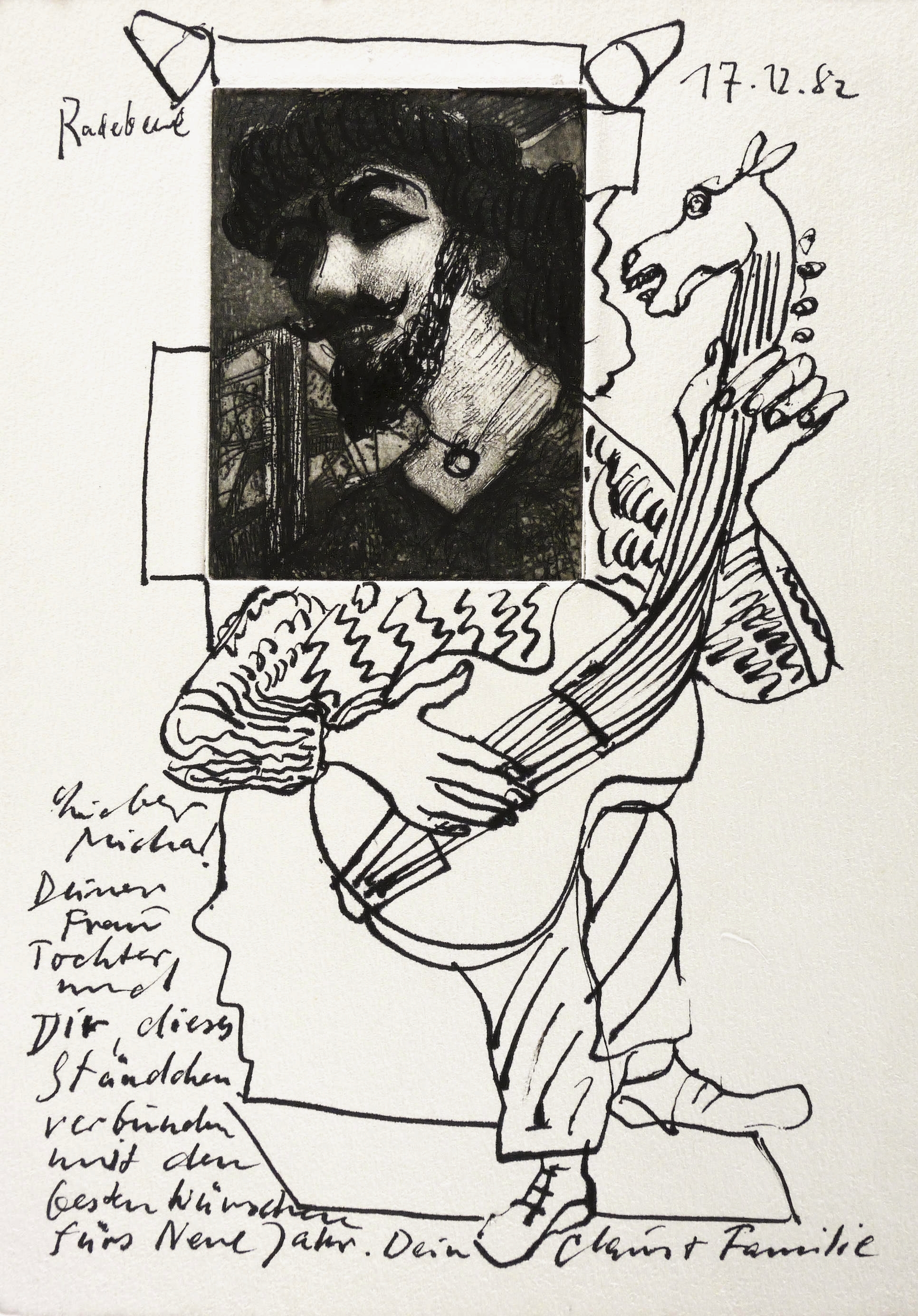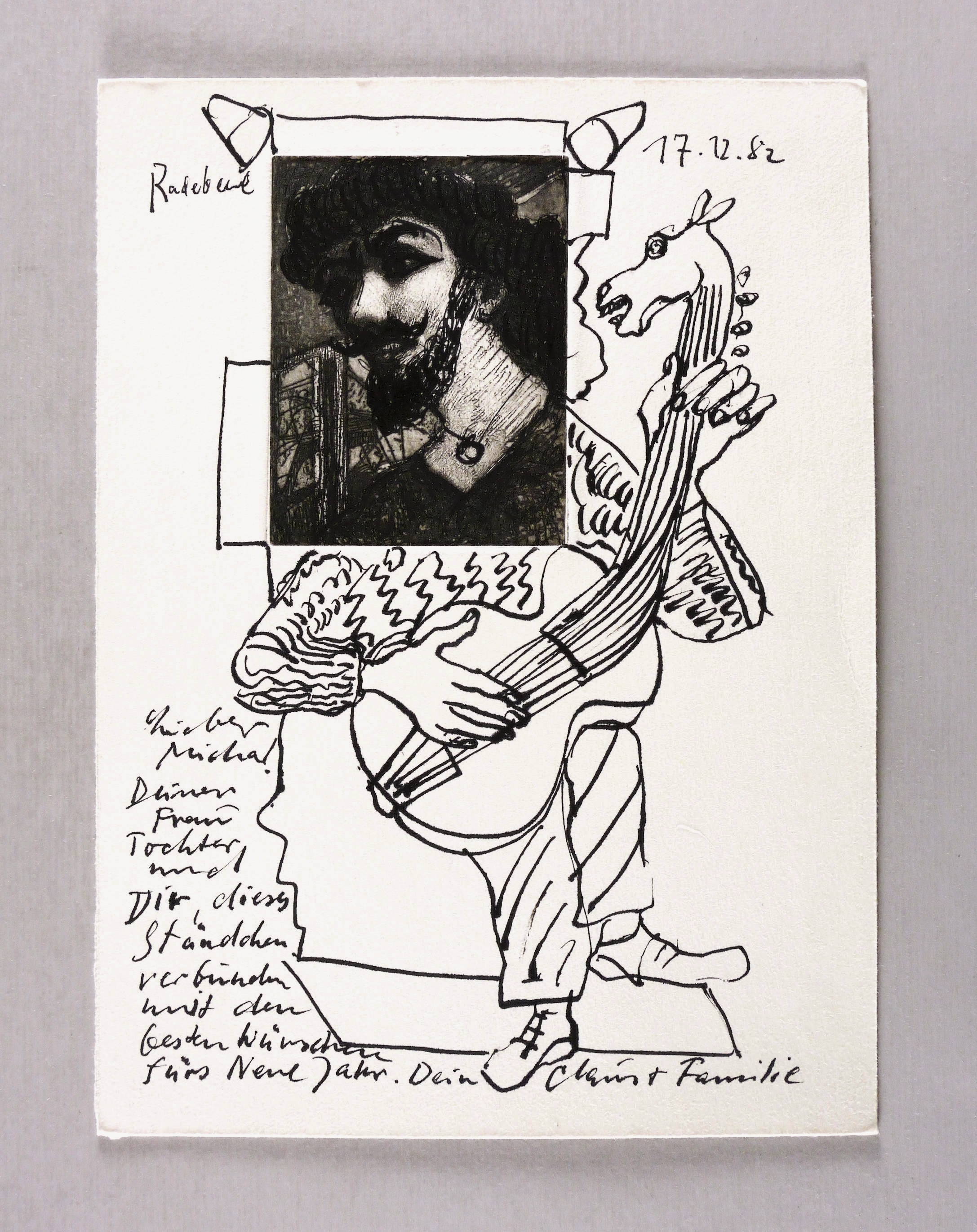 Rechts unten in schwarzer Feder signiert: ″Claus + Familie″. Oben Datum: ″Radebeul 17.12.82″. – Unter Verwendung eines Abzugs aus der Radier-Folge ″Kleine Köpfe″ von 1928 (WVZ Muschter Nr. 370-395). – Sehr guter Zustand.