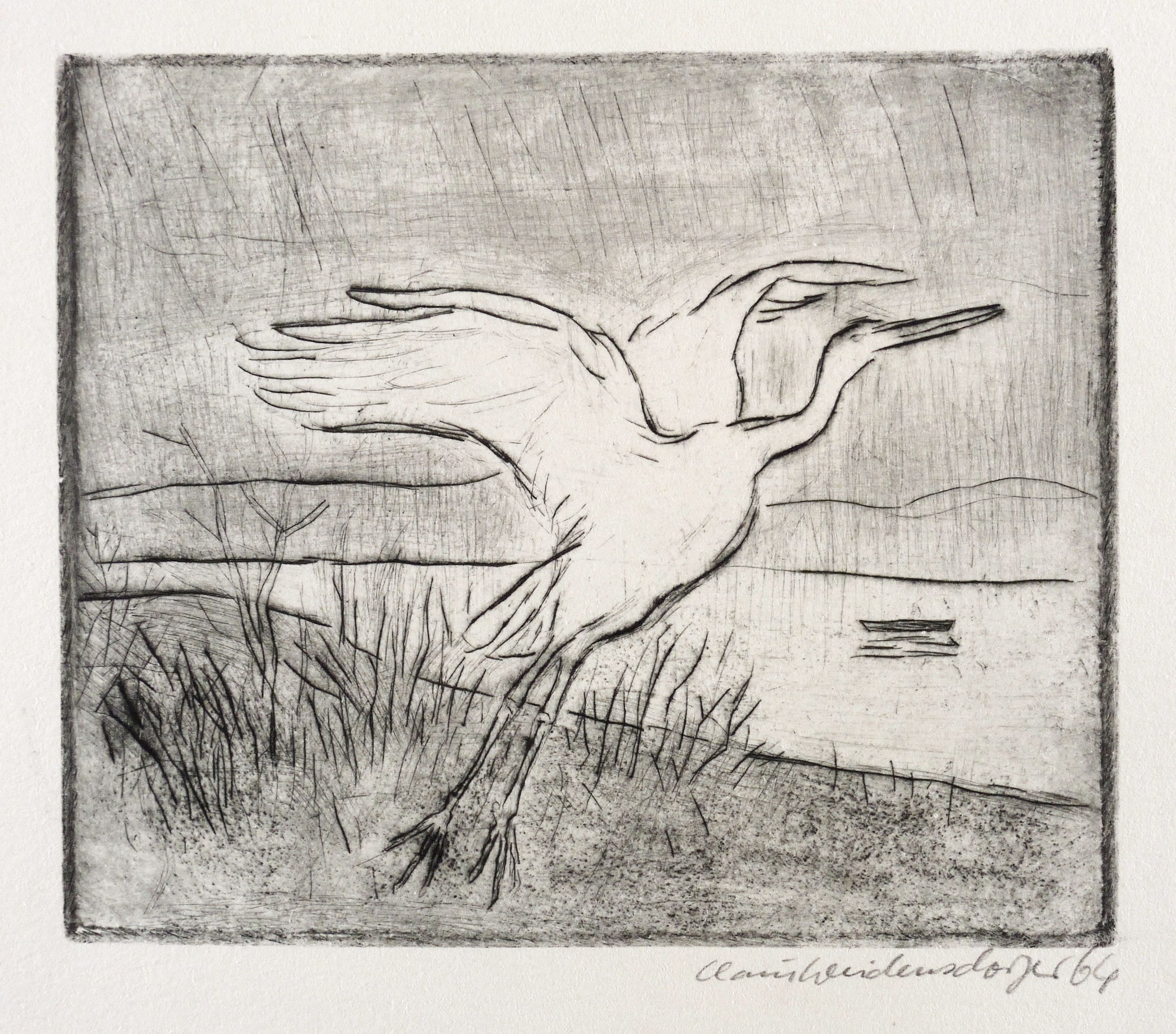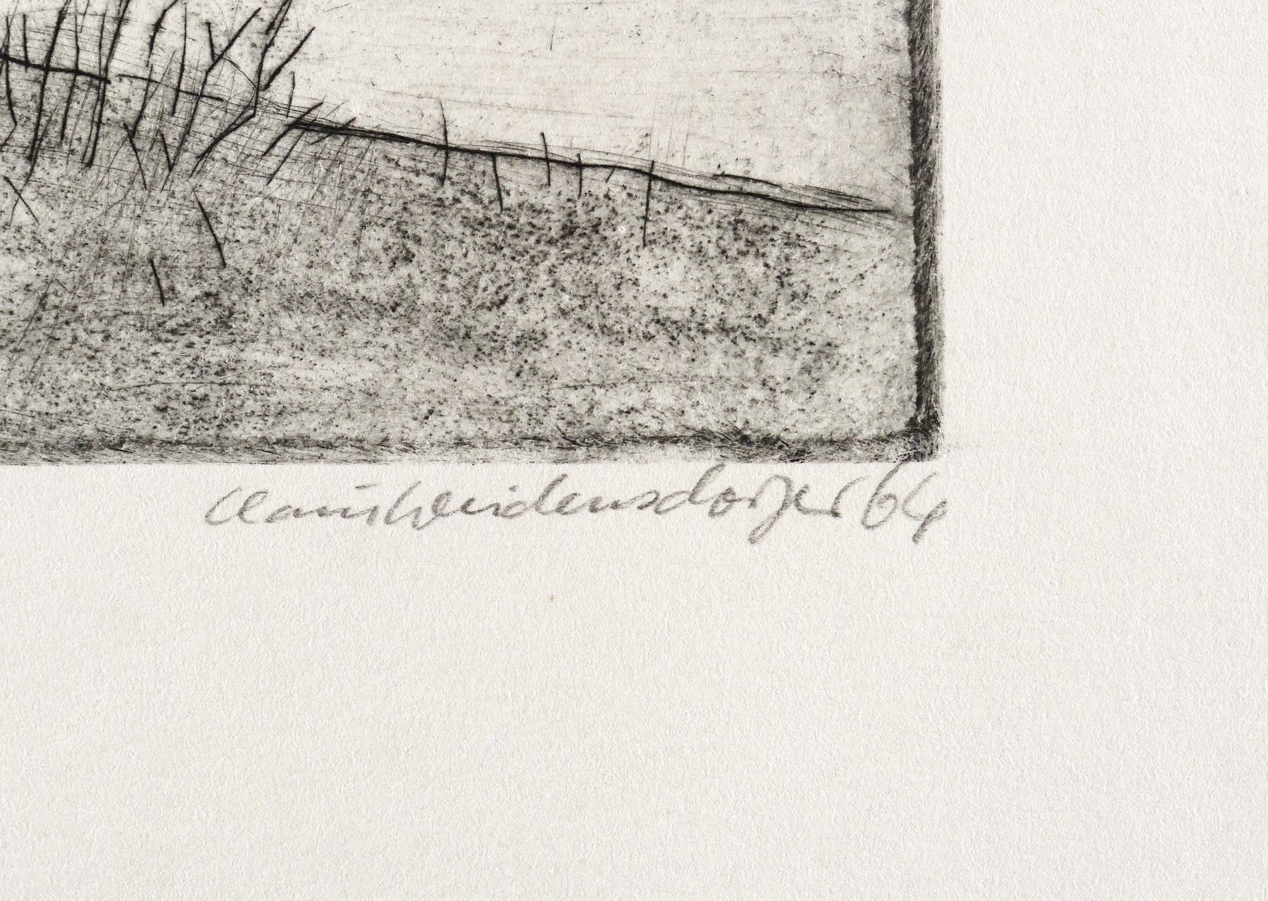 1964. Radierung / Kaltnadel, in Schwarz, auf kräftigem hellchamois Velinkarton. – Originale Künstlergrafik, von Claus Weidensdorfer. – 13,8 x 16,4 cm (Darstellung / Platte), 22 x 25 cm (Blatt).