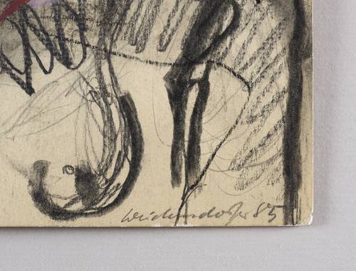 1985. Zeichnung / Gouache, über Graphit, auf gelbem Velinkarton. – Originale Künstlergrafik, von Claus Weidensdorfer. – Unikat. – 37,6 x 28,0 cm (Darstellung / Blatt).