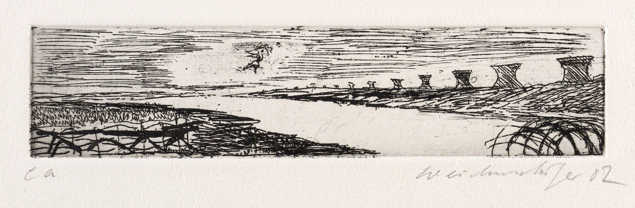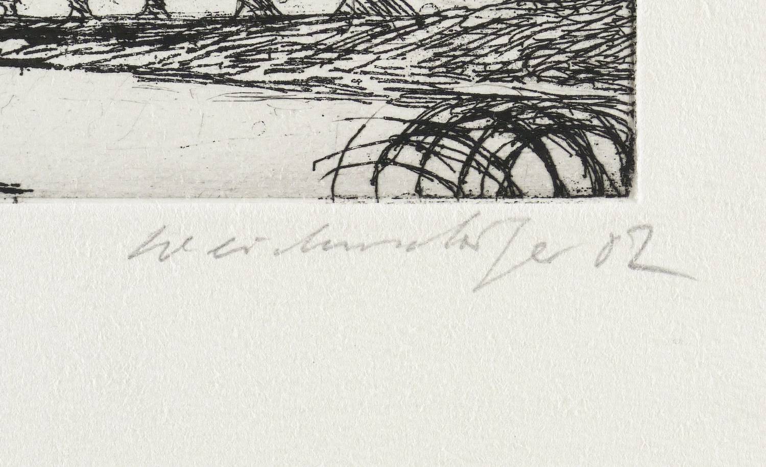 2002. Radierung / Strichätzung, in Schwarz, auf hellchamois Bütten. – Originale Künstlergrafik, von Claus Weidensdorfer. – Künstlerexemplar (e.a.). – 5,0 x 21,0 cm (Darstellung / Platte), 20 x 27 cm (Blatt).