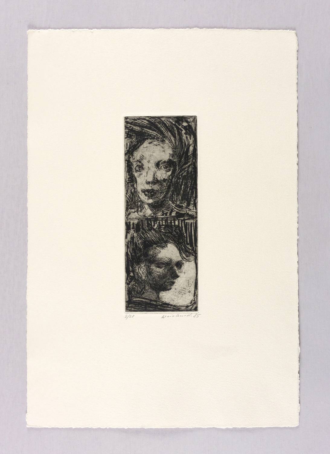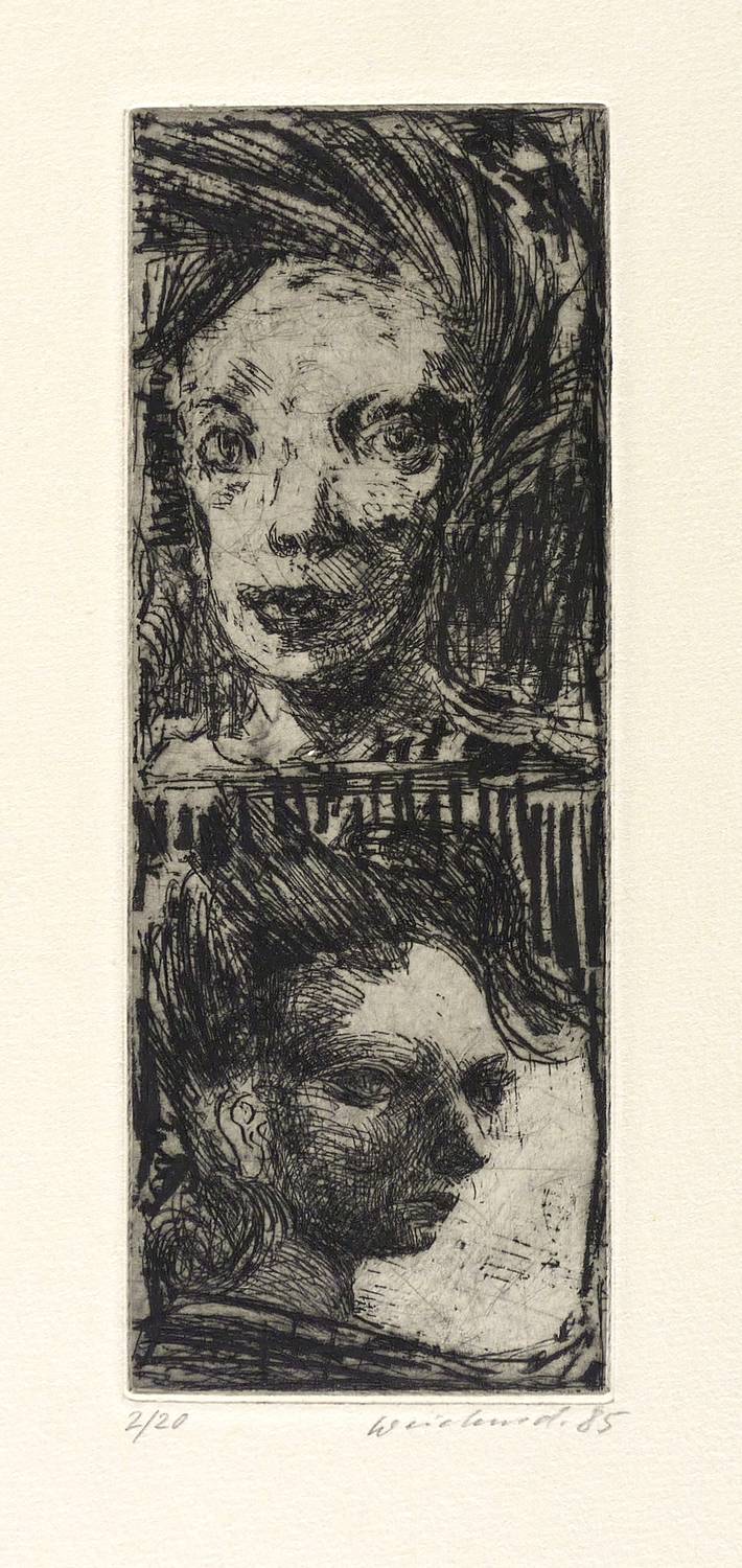 1985. Radierung / Strichätzung, in Schwarz, auf festem hellchamois Hahnemühle. – Originale Künstlergrafik, von Claus Weidensdorfer. – Auflage Exemplar Nr. 2/20. – 19,6 x 7,4 cm (Darstellung / Platte), 40 x 27 cm (Blatt).
