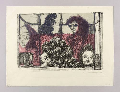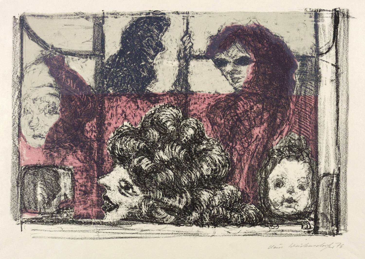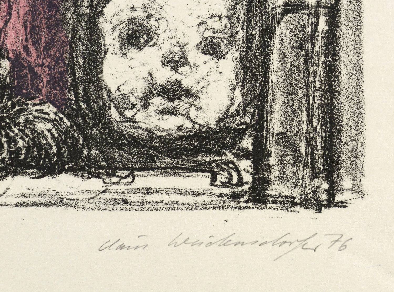 Rechts unten in Bleistift signiert und datiert: ″Claus Weidensdorfer 76″. IN der linken unteren Blattecke Auflagenbezeichnung: ″1/25″. Rechts gegenüber bezeichnet: ″(In der Straßenbahn)″. – Nicht im Werkverzeichnis von Gabriele Muschter. – Schönes dichtes Blatt. – Sehr guter Zustand.