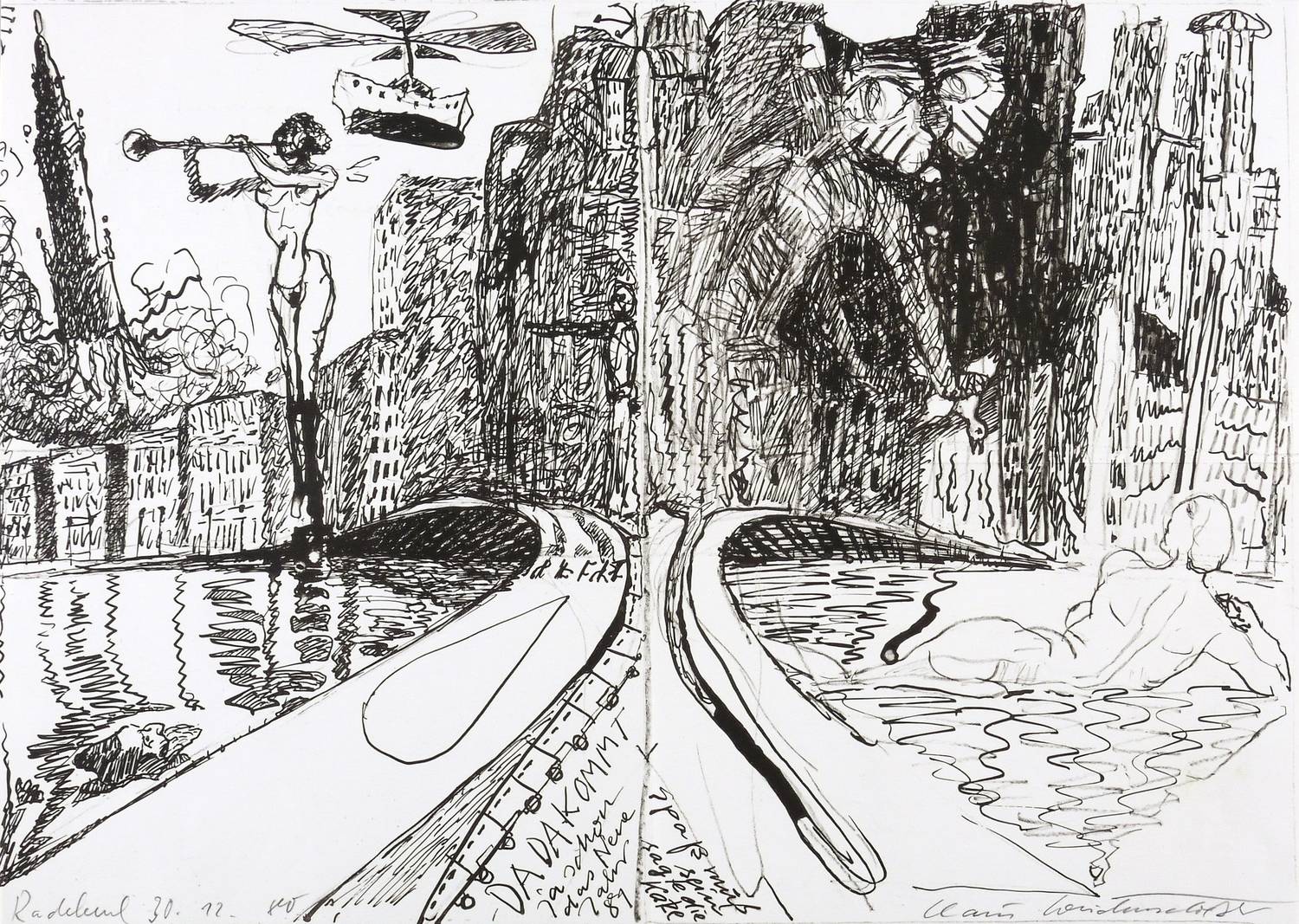 1980. Originaloffset / Kreide & Pinsel, in Schwarz, auf weißem Werkdruck. – Originale Künstlergrafik, von Claus Weidensdorfer. – 30,2 x 42,0 cm (Darstellung / Blatt).