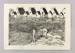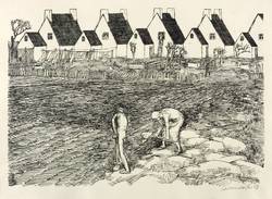 1957. Zinkografie / Federzinkografie, in Schwarz, auf hellgelbem Velinkarton. – Originale Künstlergrafik, von Claus Weidensdorfer. – 28,5 x 41,3 cm (Darstellung / Druckbild), 34 x 49 cm (Blatt).