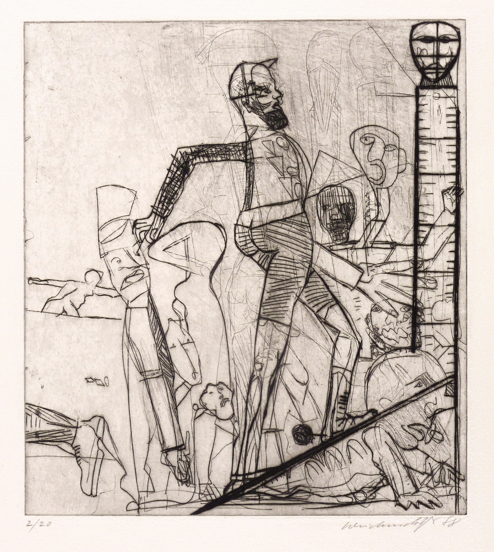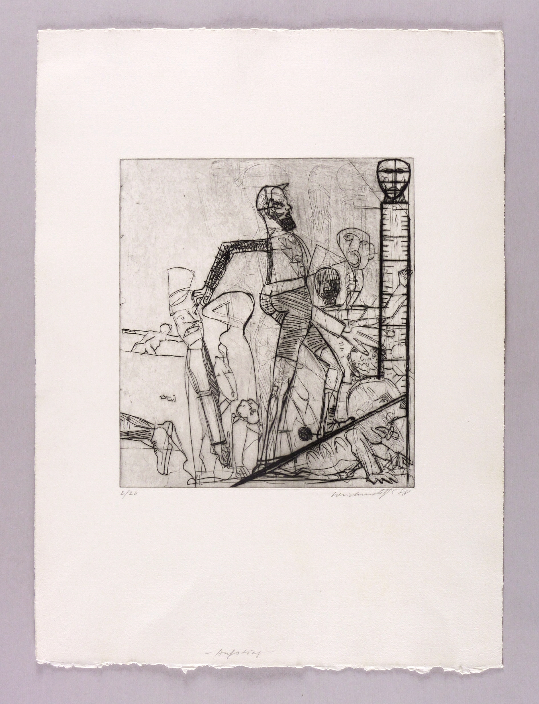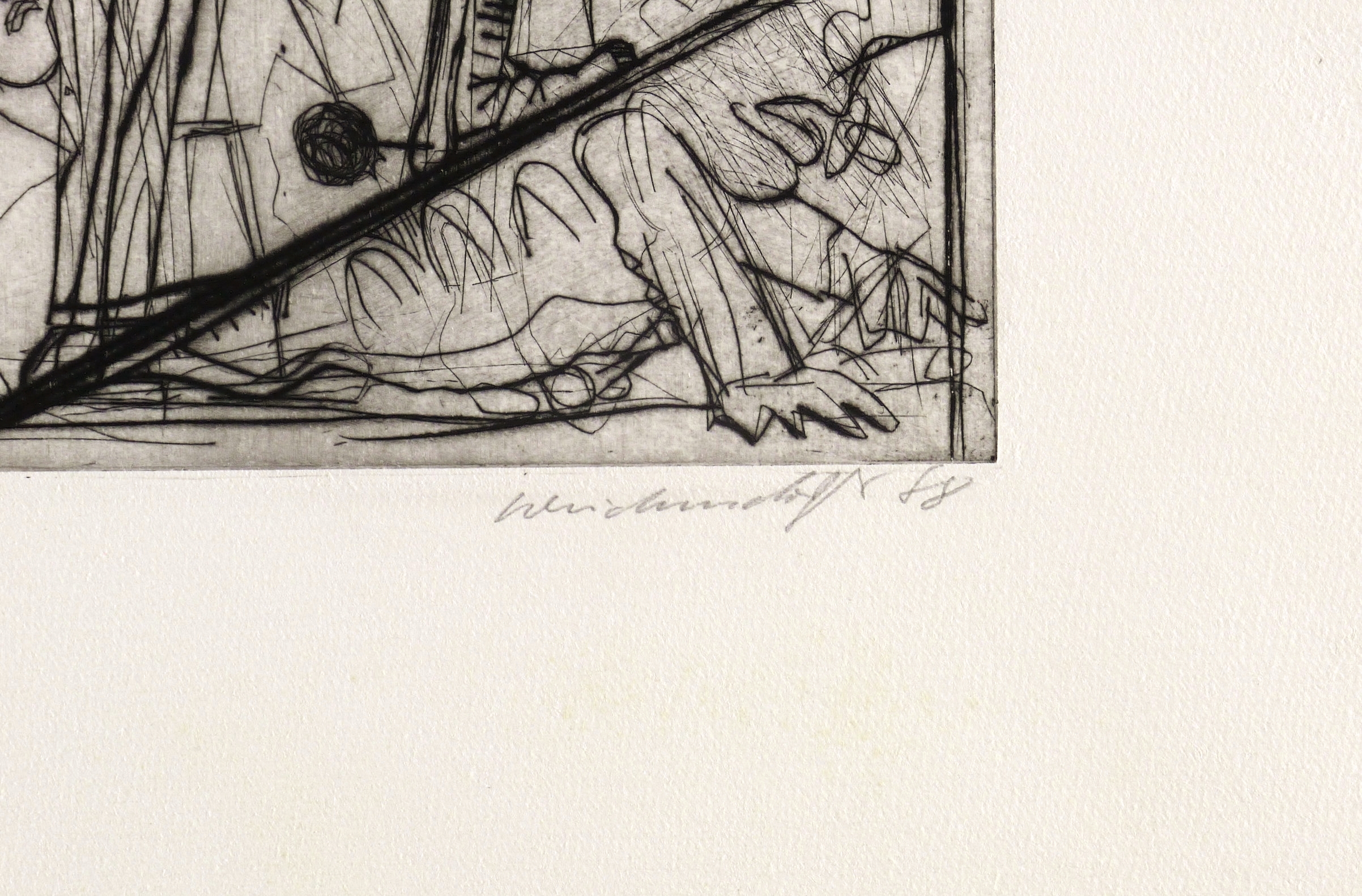 1988. Radierung / Kaltnadel, in Schwarz, auf schwerem hellchamois Hahnemühle. – Originale Künstlergrafik, von Claus Weidensdorfer. – Auflage Exemplar Nr. 2/20. – 27,6 x 24,9 cm (Darstellung / Platte), 54 x 40 cm (Blatt).