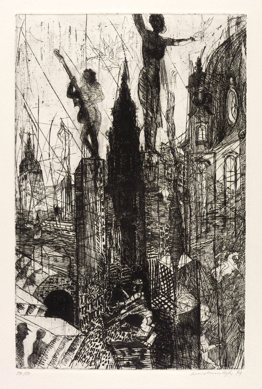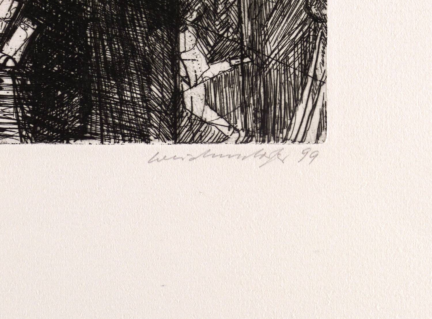 1999. Radierung / Strichätzung & Kaltnadel, in Schwarz, auf schwerem hellchamois Hahnemühle. – Originale Künstlergrafik, von Claus Weidensdorfer. – Auflage Exemplar Nr. 37/50. – 49,7 x 32,2 cm (Darstellung / Platte), 79 x 54 cm (Blatt).