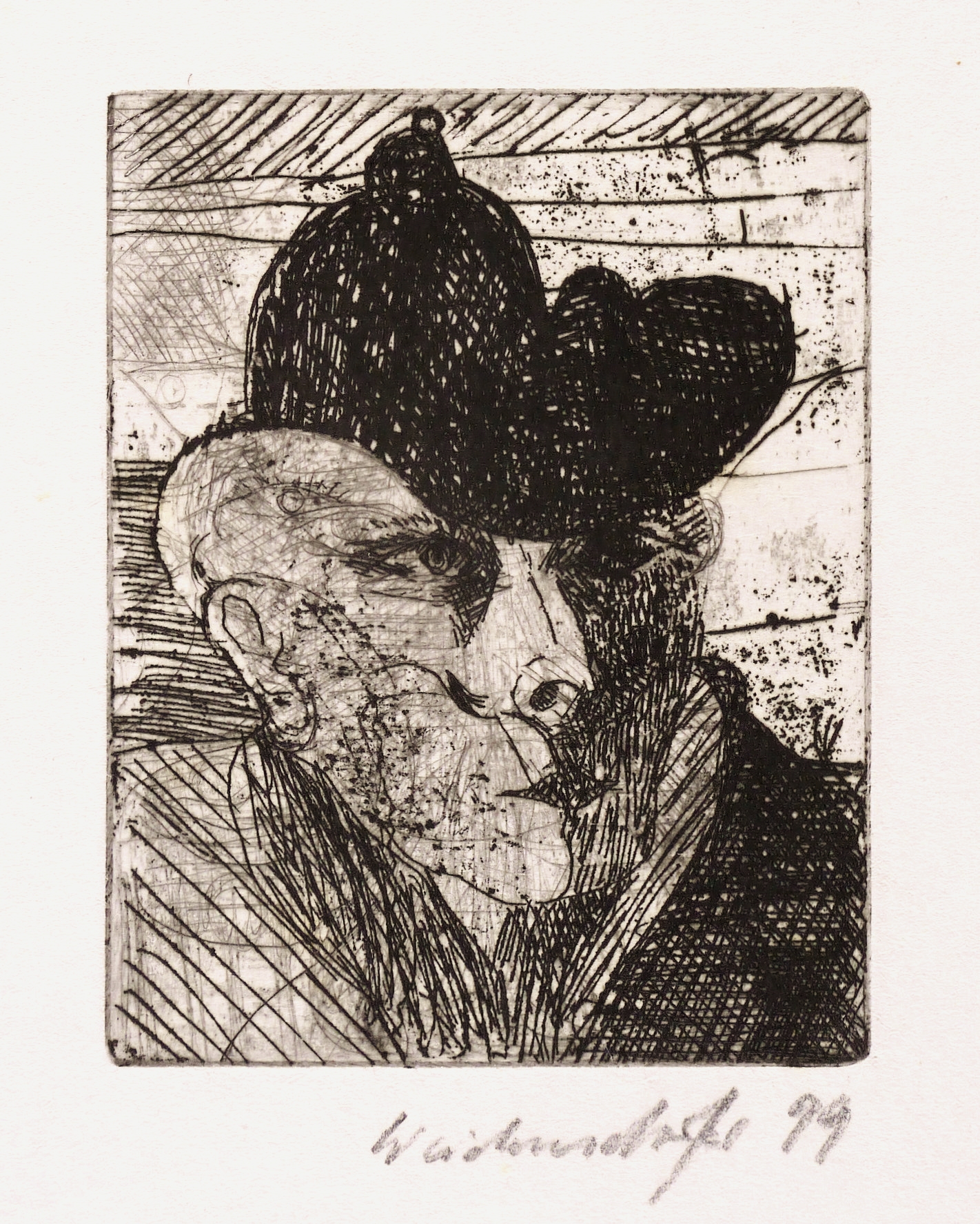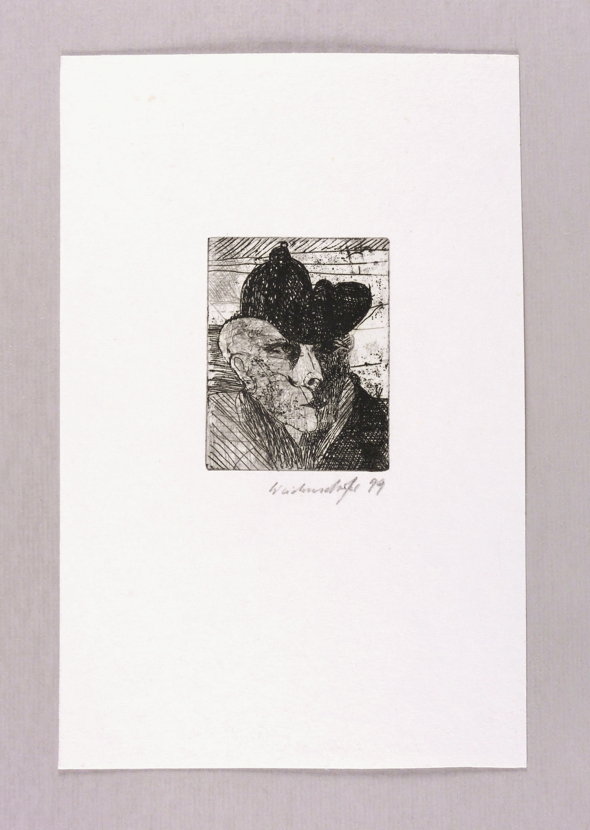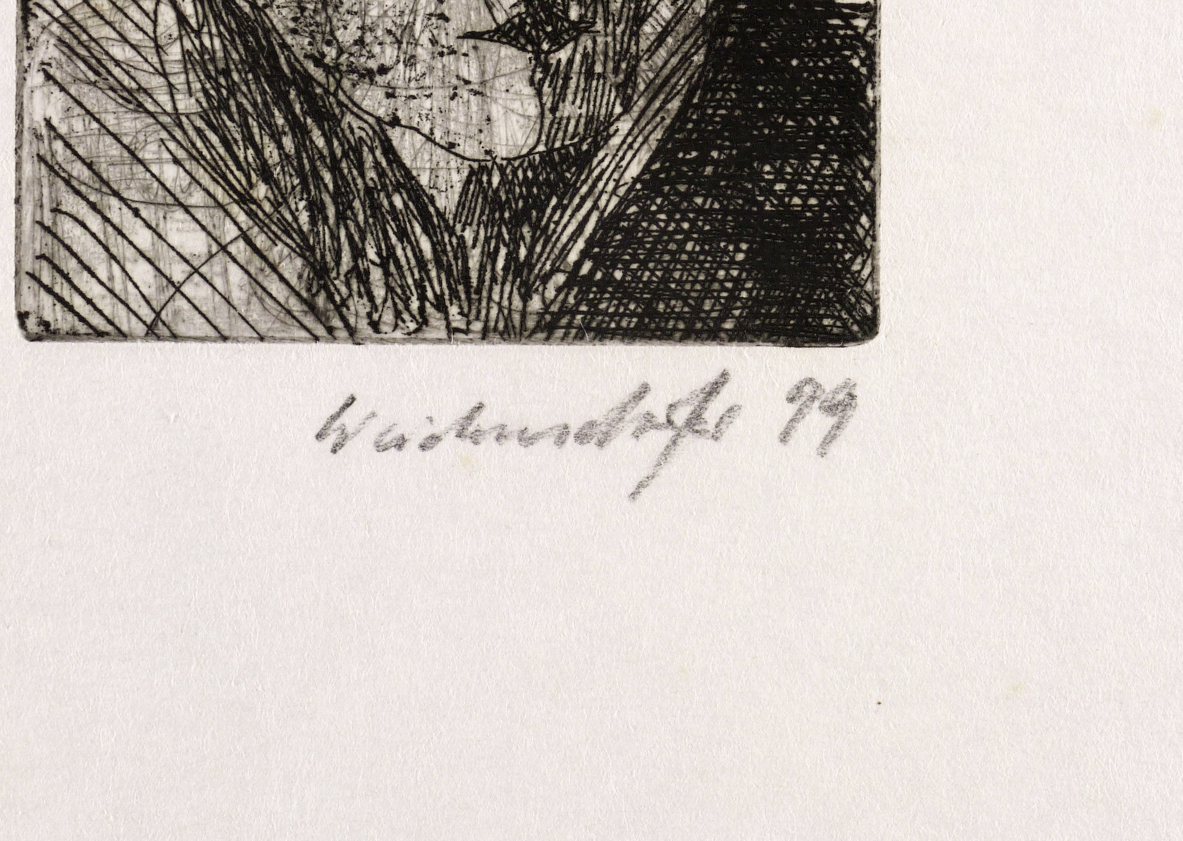 1999. Radierung / Strichätzung & Kaltnadel, in Schwarz, auf hellchamois Velin. – Originale Künstlergrafik, von Claus Weidensdorfer. – Druckerexemplar. – 8,4 x 6,6 cm (Darstellung / Platte), 17 x 27 cm (Blatt).