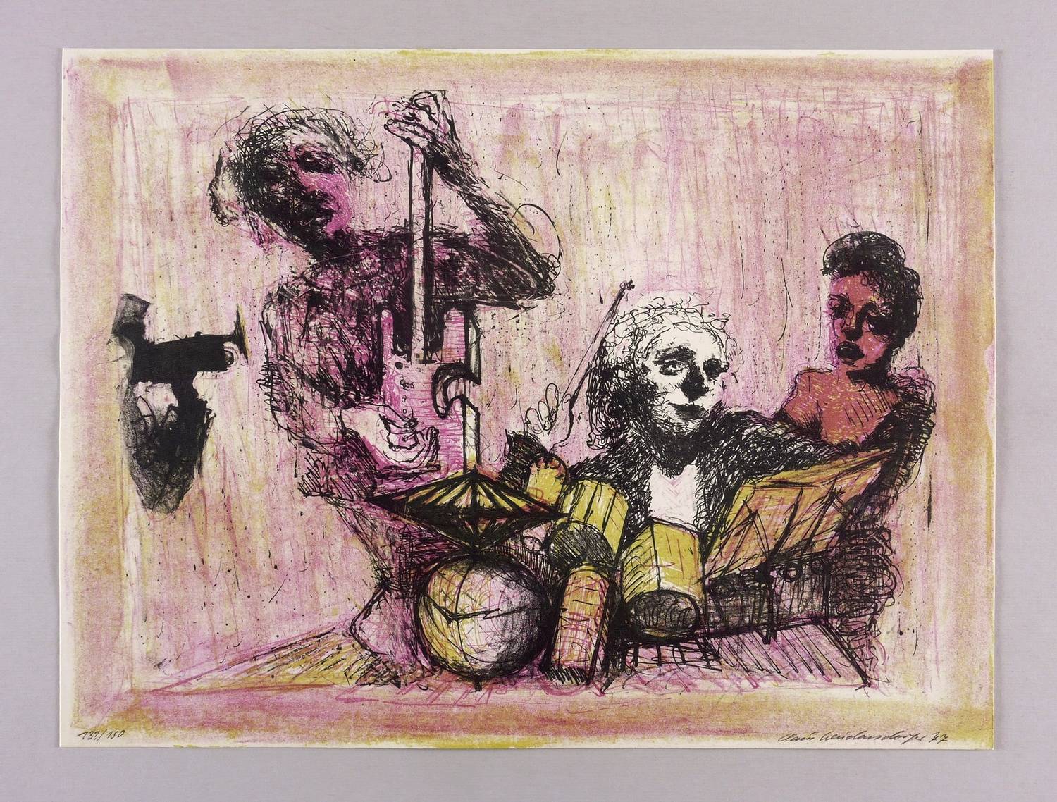 1976. Farblithografie / Kreide-, Feder- & Pinsellithografie, in 3 Farben, auf hartem hellchamois Velin. – Originale Künstlergrafik, von Claus Weidensdorfer. – Auflage Exemplar Nr. 131/150. – 37,4 x 49,8 cm (Darstellung / Blatt).