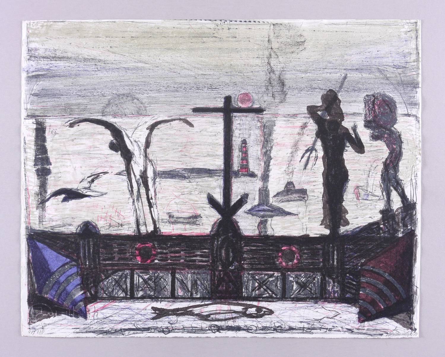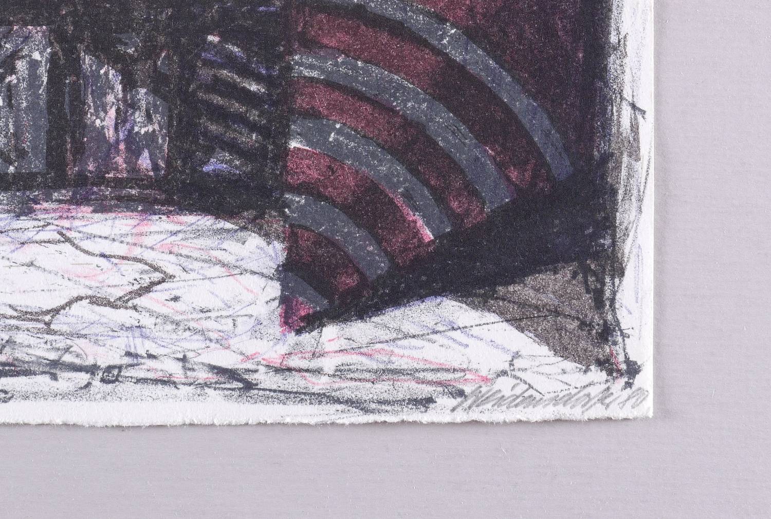 1980. Farblithografie / Kreide- & Pinsellithografie, partiell geschabt, in 5 Farben, auf hellchamois Hahnemühle. – Originale Künstlergrafik, von Claus Weidensdorfer. – Auflage Exemplar Nr. 40/225. – 40,0 x 50,3 cm (Darstellung / Blatt).