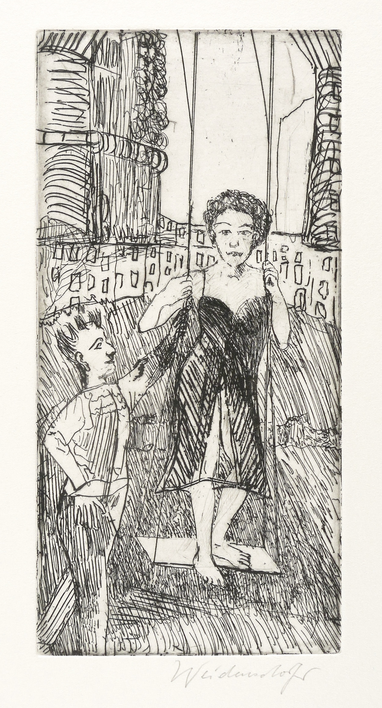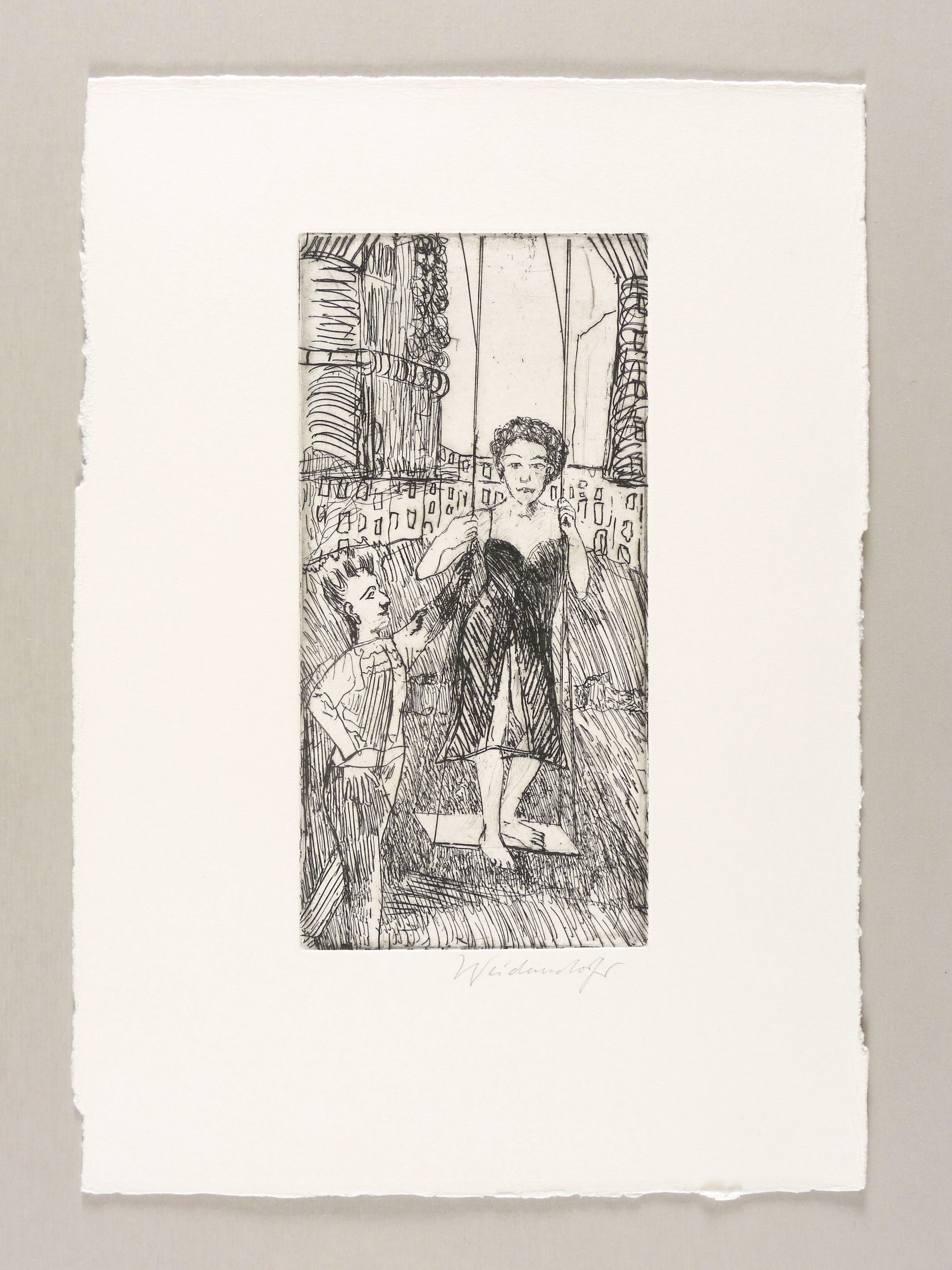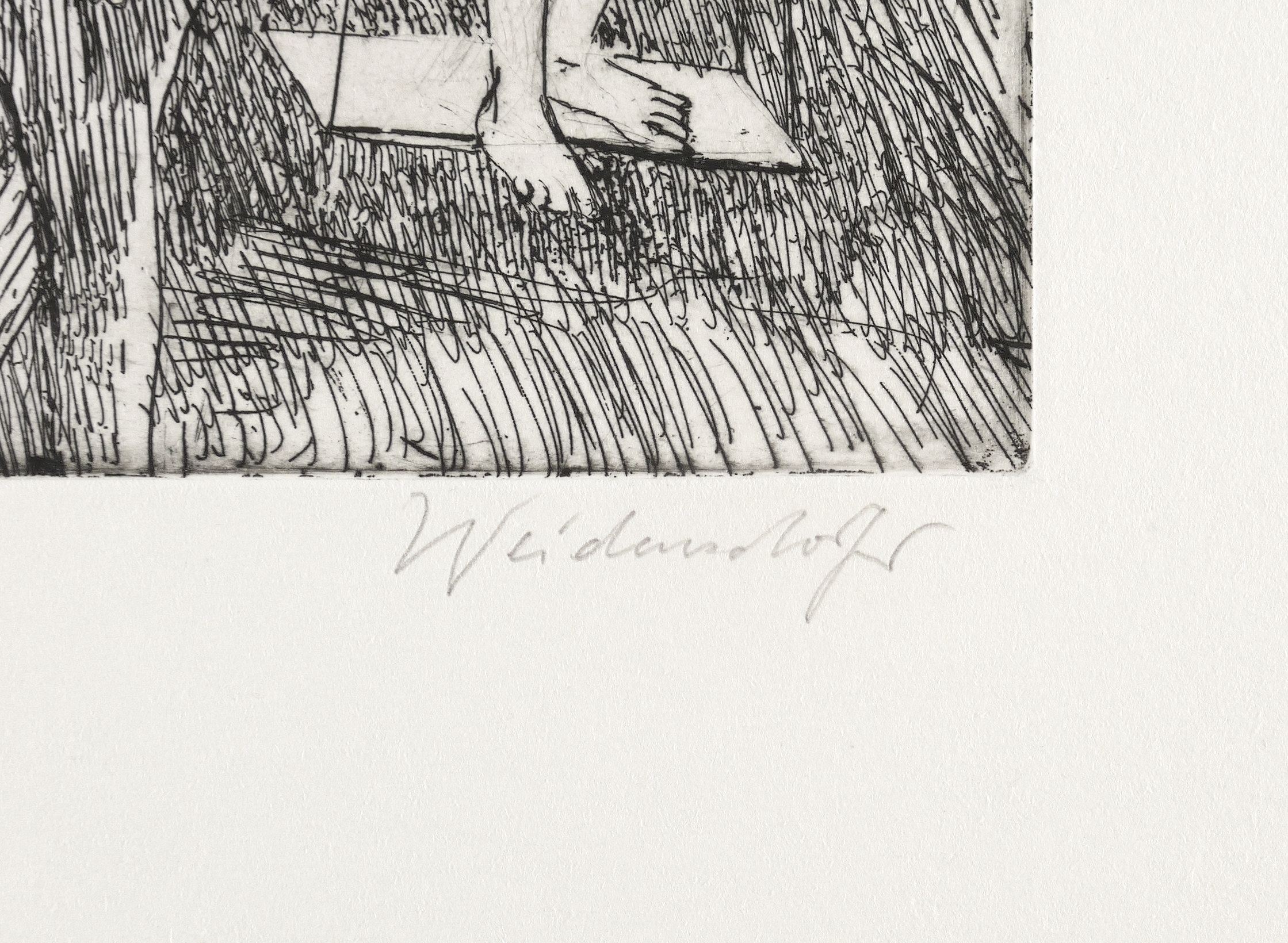 1990-2000. Radierung / Strichätzung & Kaltnadel, in Schwarz, auf kräftigem hellchamois Velin. – Originale Künstlergrafik, von Claus Weidensdorfer. – 24,7 x 12,1 cm (Darstellung / Platte), 39 x 27 cm (Blatt).