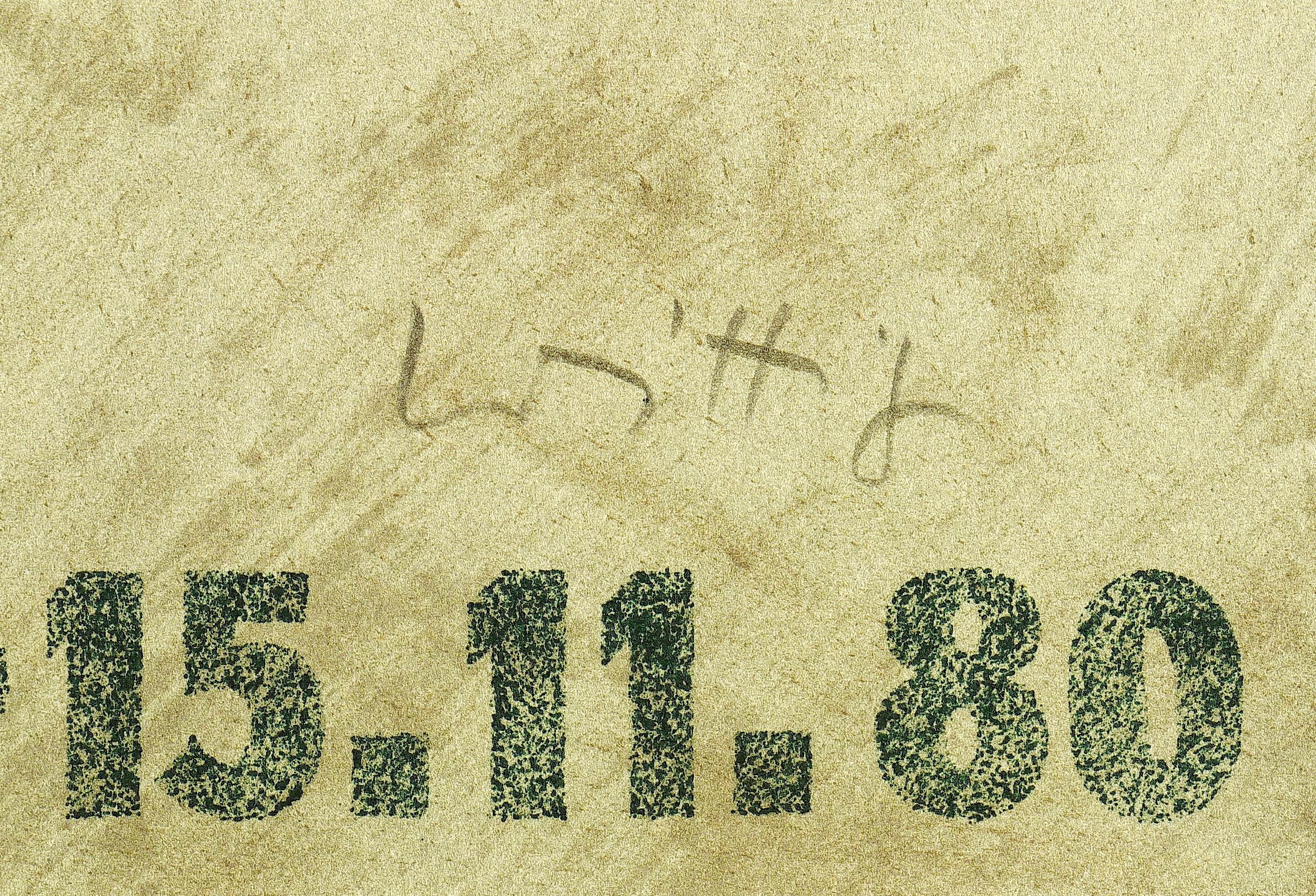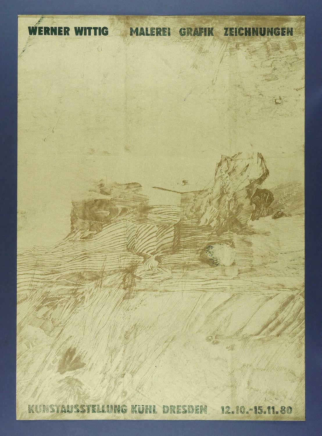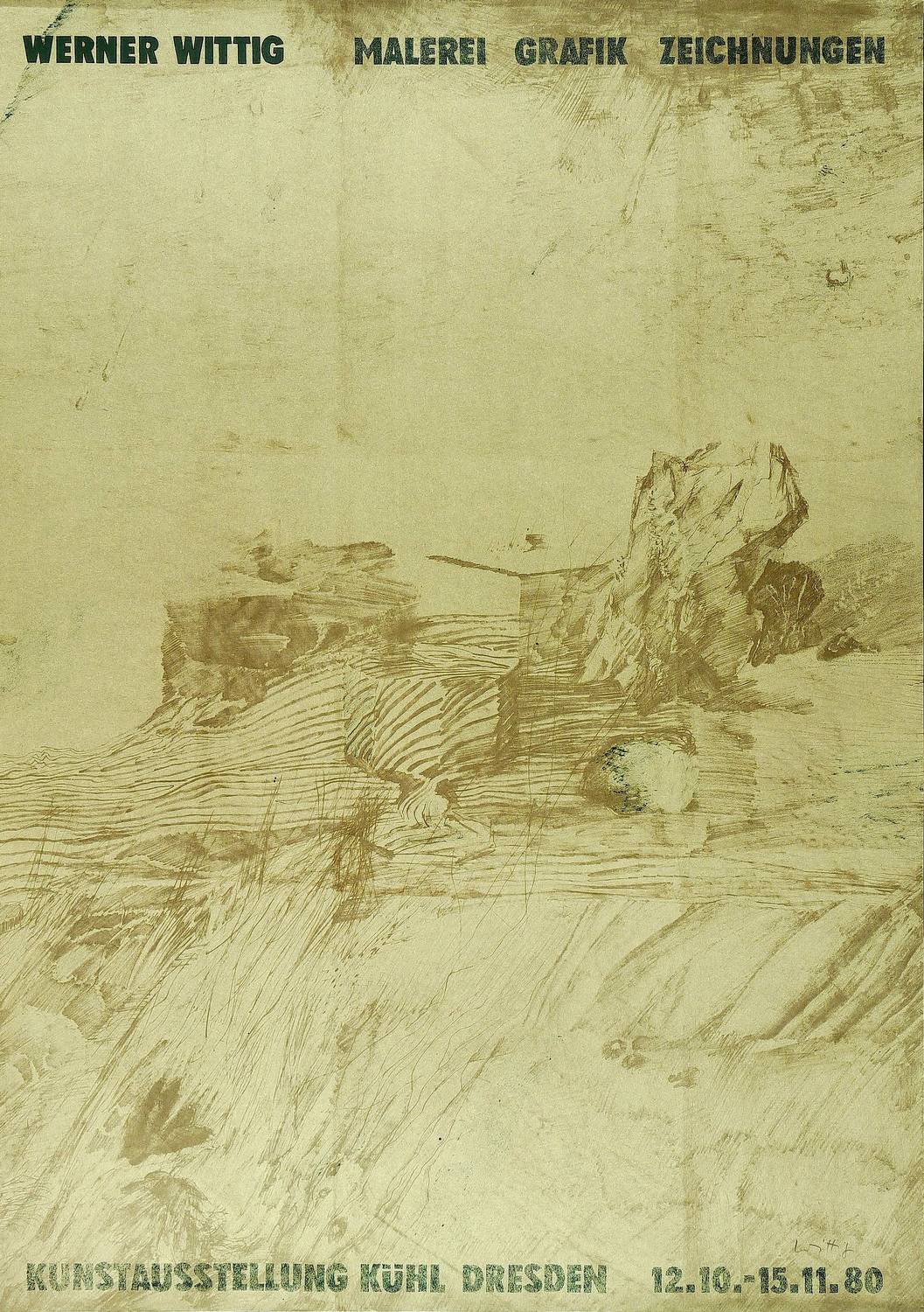 Links unten in Bleistift signiert. – Originalgrafisches Künstlerplakat zur Ausstellung ″Werner Wittig / Malerei Grafik Zeichnung″ 1980 in der Galerie Kunstausstellung Kühl in Dresden. – Marginale Knickspuren. Guter Zustand.