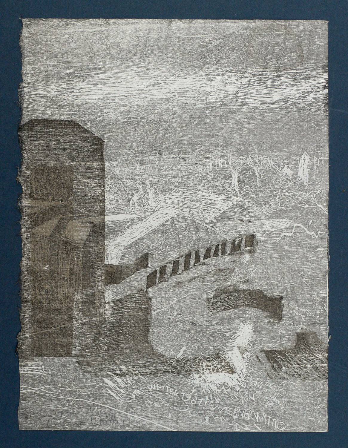 Nicht bei Reinhardt (2000). – In der Darstellung links unten signiert: ″Werner Wittig″. Im Druckstock rechts unten bezeichnet: ″GUTES WETTER 1981! WERNER WITTIG″. – Charmantes Blatt. – Weitgehend ausgelegene originale Vertikalfalte vom Versand als Grußkarte. Sehr guter Zustand.
