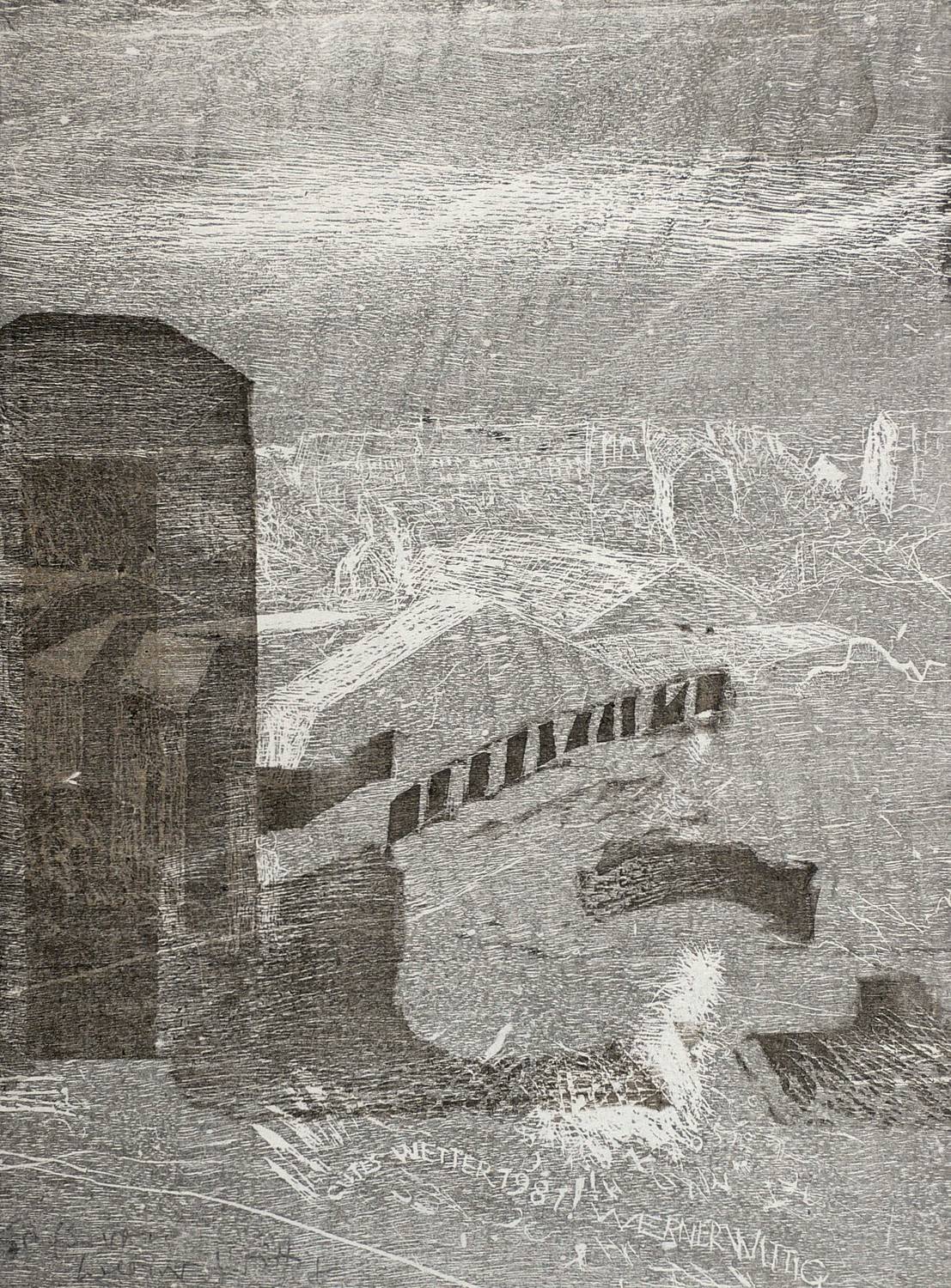 1980. Farbholzriss, in 2 Farben, auf weichem fasrigem Bütten. – Originale Künstlergrafik, von Werner Wittig. – Auflage Exemplar Nr. 56/110. – 24,3 x 18,1 cm (Darstellung / Blatt).
