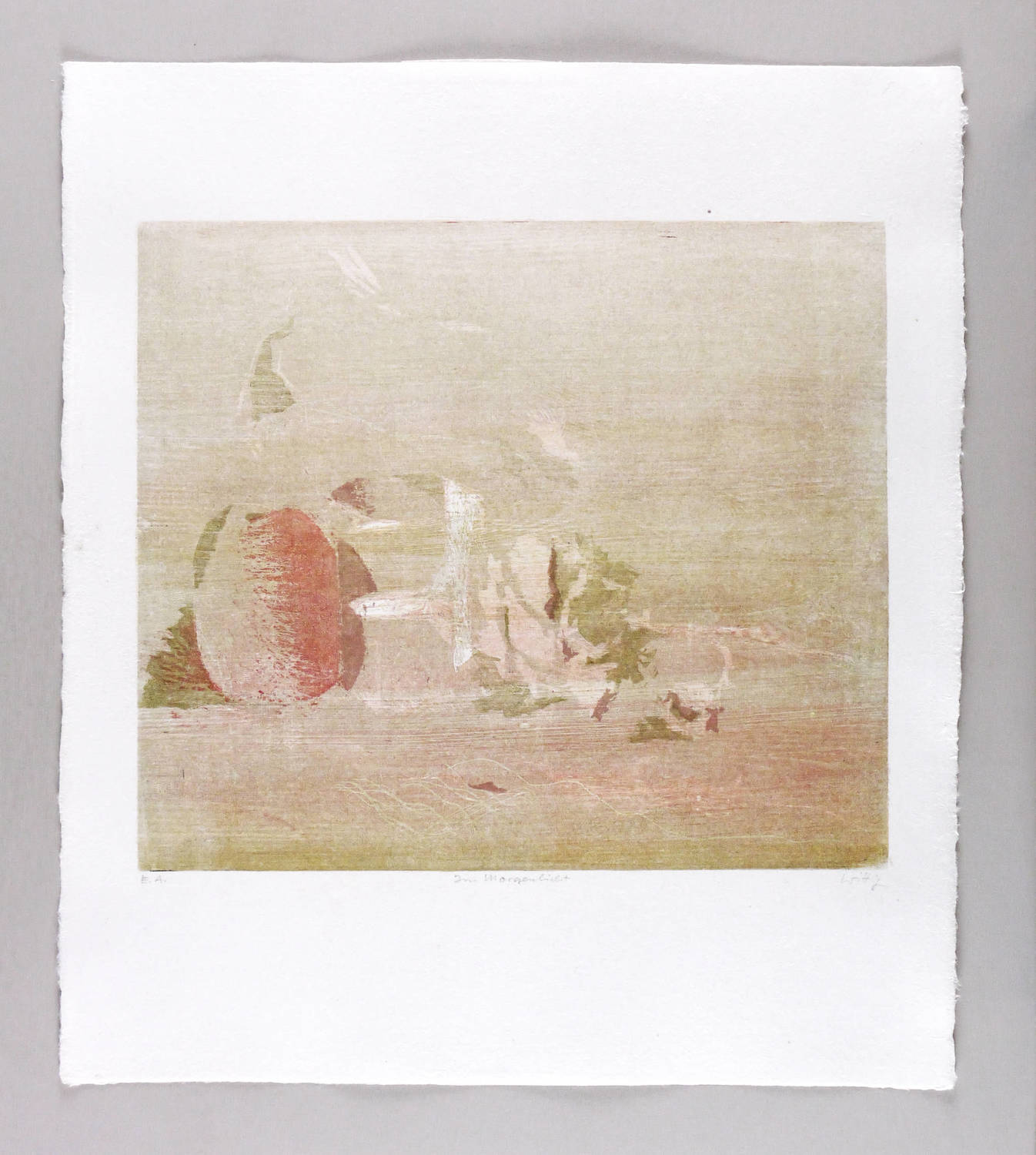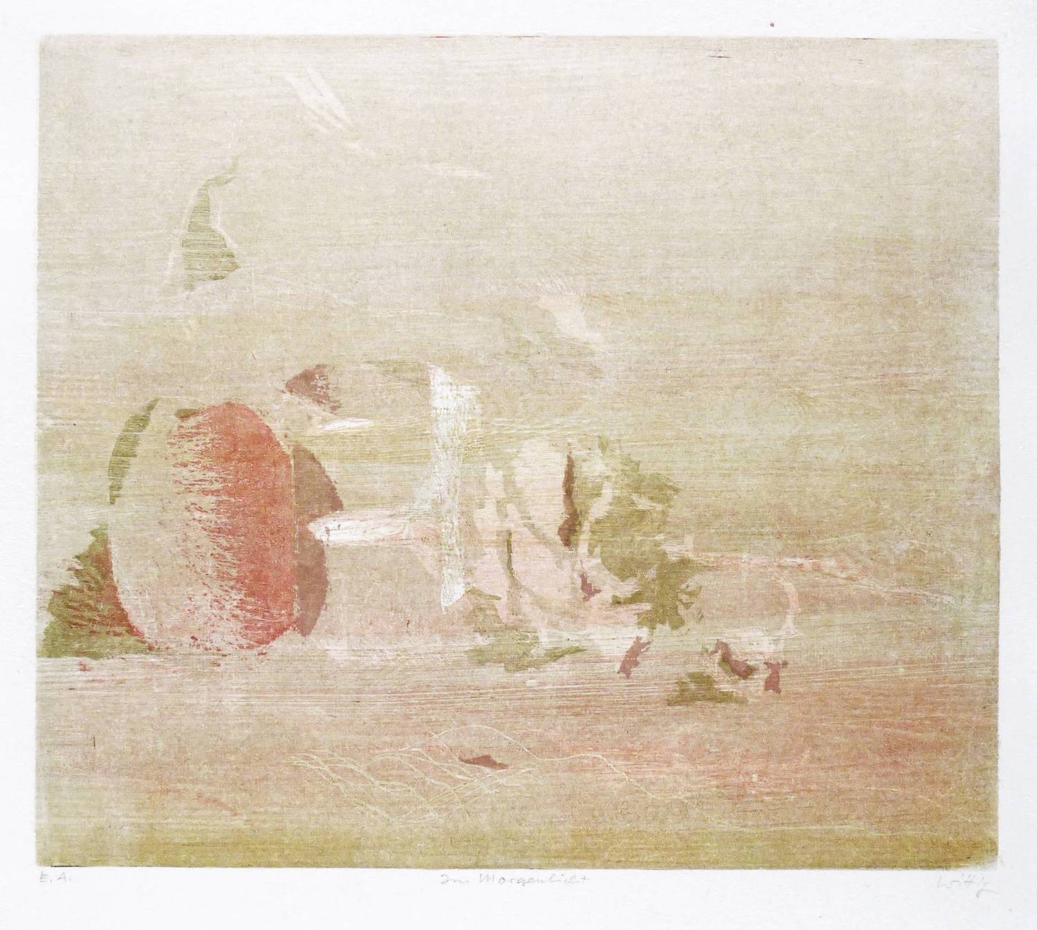 Reinhardt (2000) 216 a (von b). Reinhardt (1993) 368 a (von b). – Rechts unten in Bleistift signiert: ″Wittig″. Links Auflagenbezeichnung: ″E.A.″ Mittig Titel: ″Im Morgenlicht″. – Eines von 20 Künstlerexemplaren. – Schönes Blatt. Sehr guter Zustand.