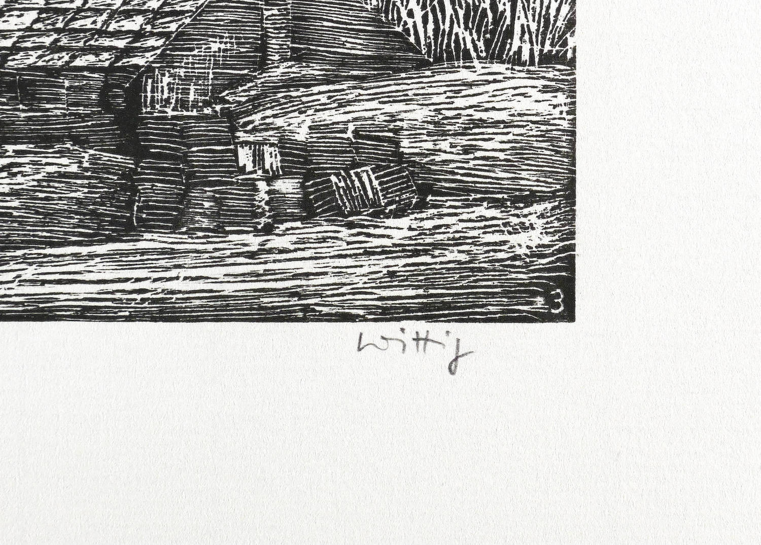 1973. Holzriss, in Schwarz, auf rauem hellchamois Maschinenbütten. – Originale Künstlergrafik, von Werner Wittig. – Auflage 145 Exemplare. – 19,8 x 24,8 cm (Darstellung / Druckstock), 29 x 36 cm (Blatt).