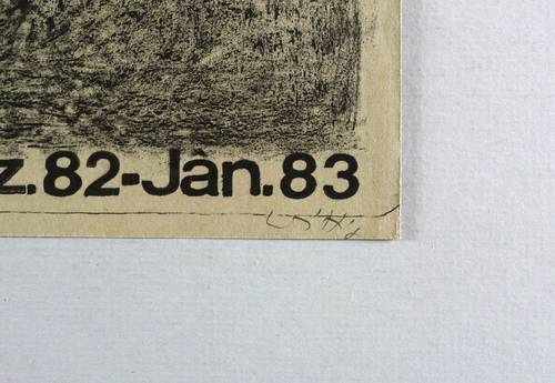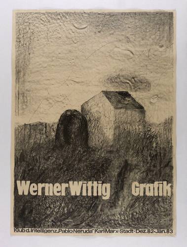 Rechts unten in Bleistift signiert: ″Wittig″. Links Widmung an den Steindrucker Michael Wackwitz, Dresden. – Originalgrafisches Künstlerplakat zur Ausstellung ″Werner Wittig. Grafik″ Dezember 1982 bis Januar 1983 im Klub der Intelligenz Pablo Neruda in Karl-Marx-Stadt (Chemnitz). – Tadellos. Sehr guter Zustand.