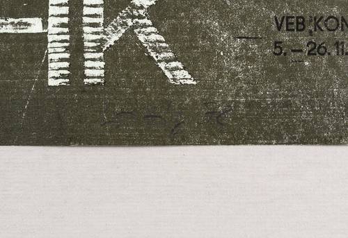 In Bleistift unterhalb signiert und datiert: ″Wittig 78″. – Originalgrafisches Künstlerplakat zur Ausstellung ″Holzdruck-Grafik. 10 Jahre Interessengemeinschaft Bbildende Kunst im VEB Komplette Chemieanlagen Dresden″ im Pretiosensaal im Residenzschloss in Dresden 5.-26.11.1978. – Nicht bei Reinhardt (1993). – Randloser Druck. – Sehr guter Zustand.