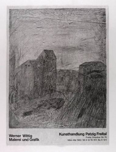 Links unten in Bleistift signiert: ″Wittig″. – Originalgrafisches Künstlerplakat zur Ausstellung ″Werner Wittig. Malerei und Grafik″ März-Mai 1983 in der Kunsthandlung Patzig in Freital. – Nicht bei Reinhardt (1993). – Tadellos. Sehr guter Zustand.