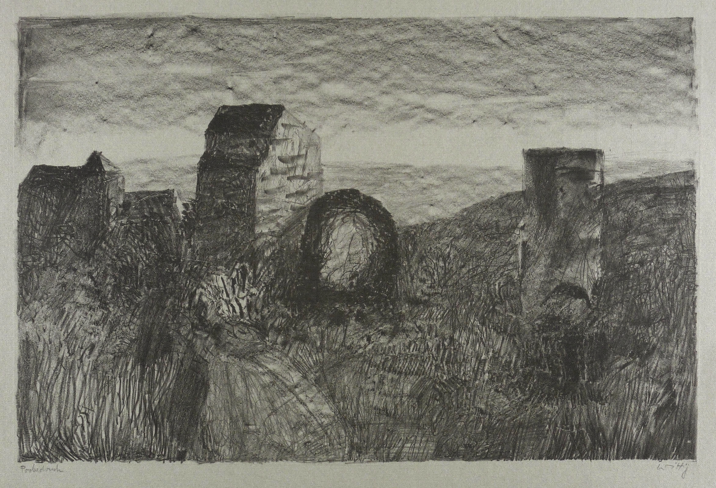 1982. Zinkografie / Kreidezinkografie, in Schwarz, auf graugrün getöntem Hahnemühle. – Originale Künstlergrafik, von Werner Wittig. – Probedruck. – 48 x 62 cm (Blatt), 34,5 x 52,5 cm (Darstellung / Druckbild).