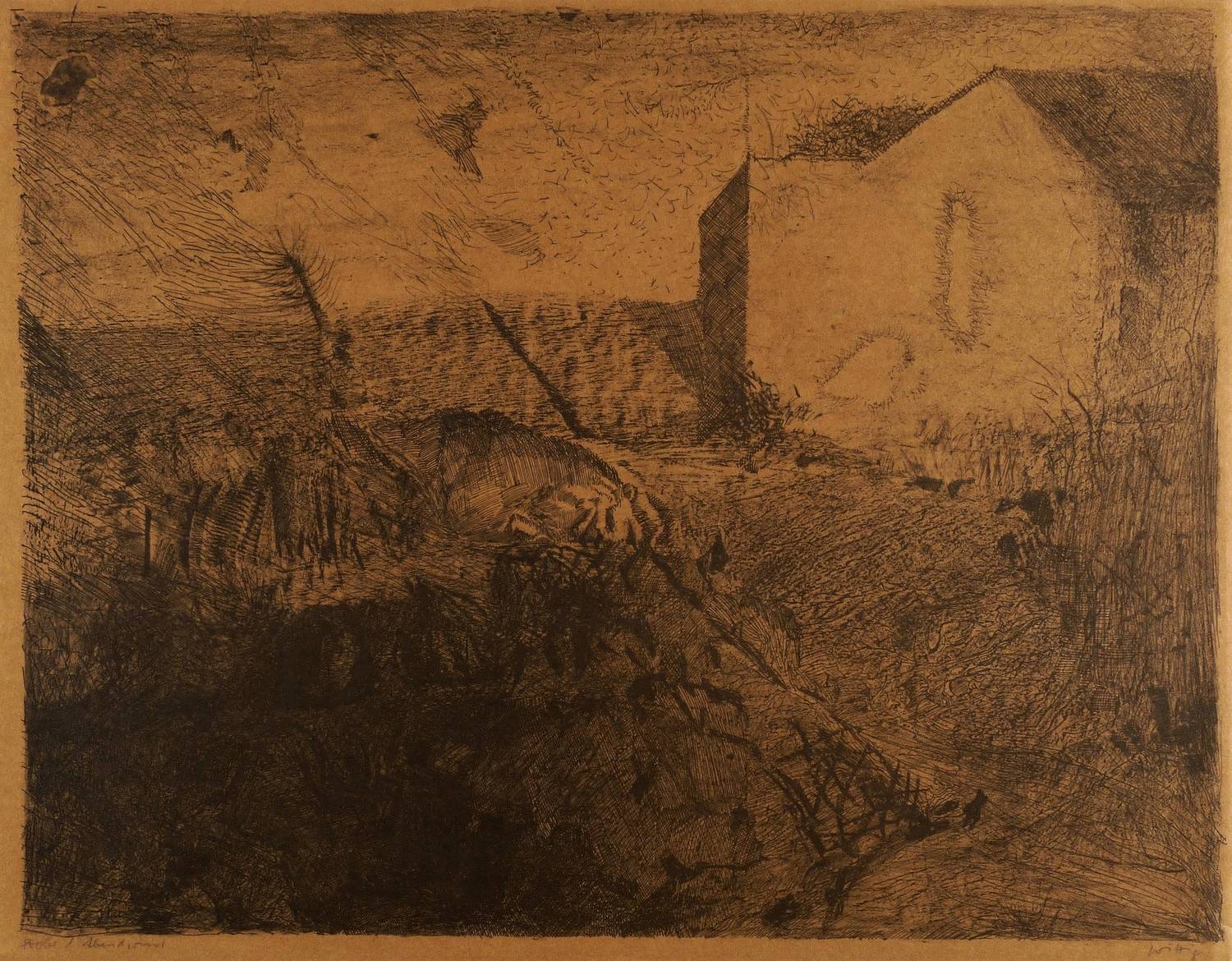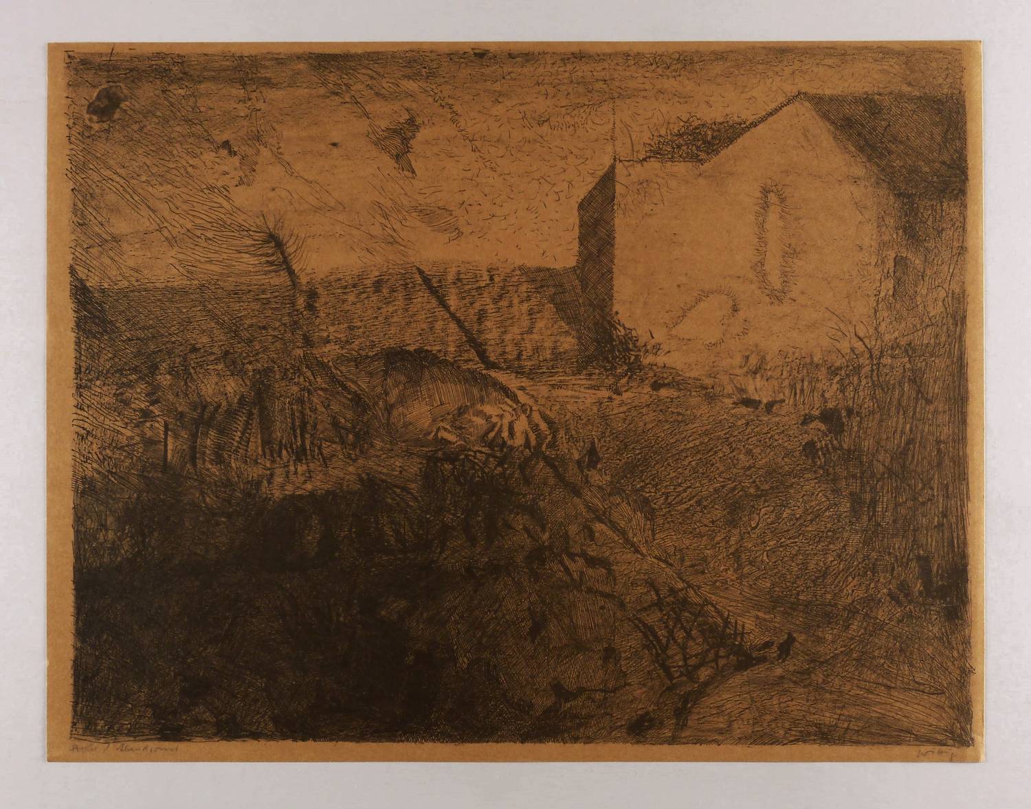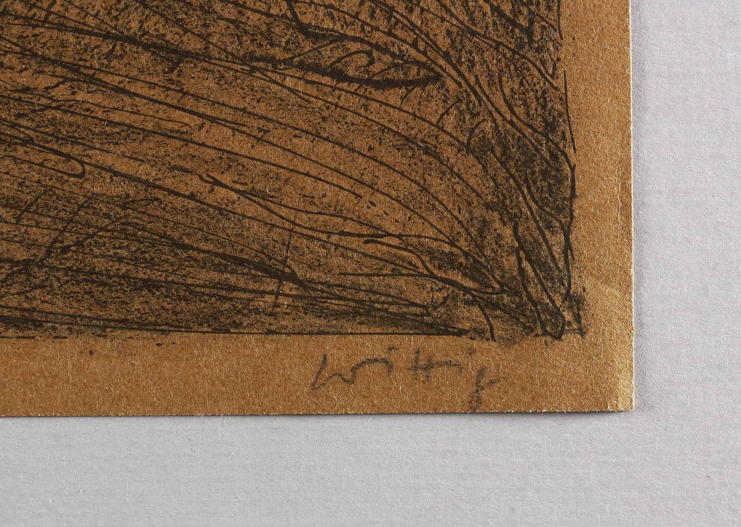1982. Zinkografie / Kreidezinkografie, in Schwarz, auf orangebraun getöntem Velinkarton. – Originale Künstlergrafik, von Werner Wittig. – Probedruck. – 51 x 66 cm (Blatt), 48,3 x 63,1 cm (Darstellung / Druckbild).
