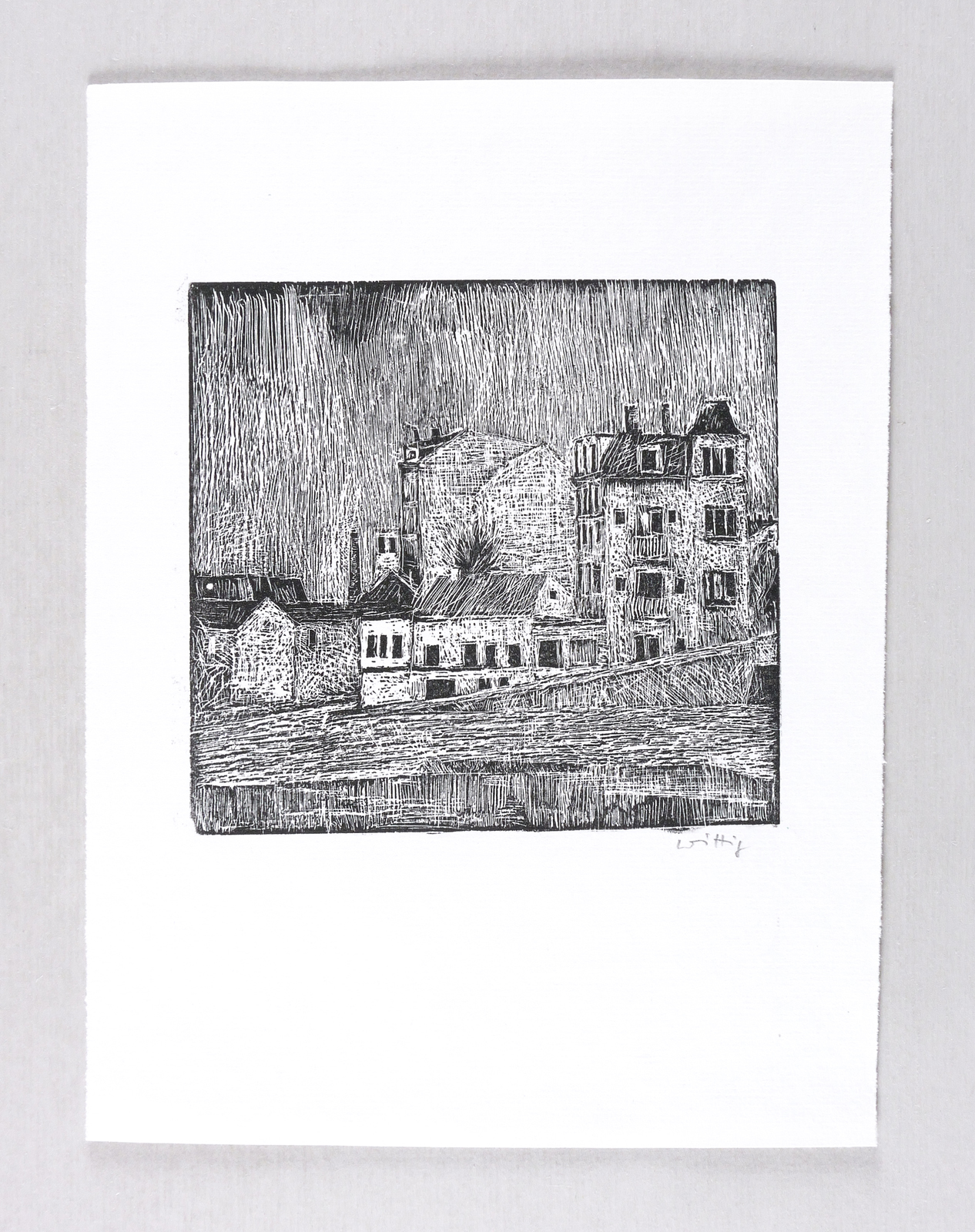 1971. Holzriss, in Schwarz, auf weißlichem Maschinenbütten. – Originale Künstlergrafik, von Werner Wittig. – 14,2 x 15,1 cm (Darstellung / Druckbild), 28 x 21 cm (Blatt).