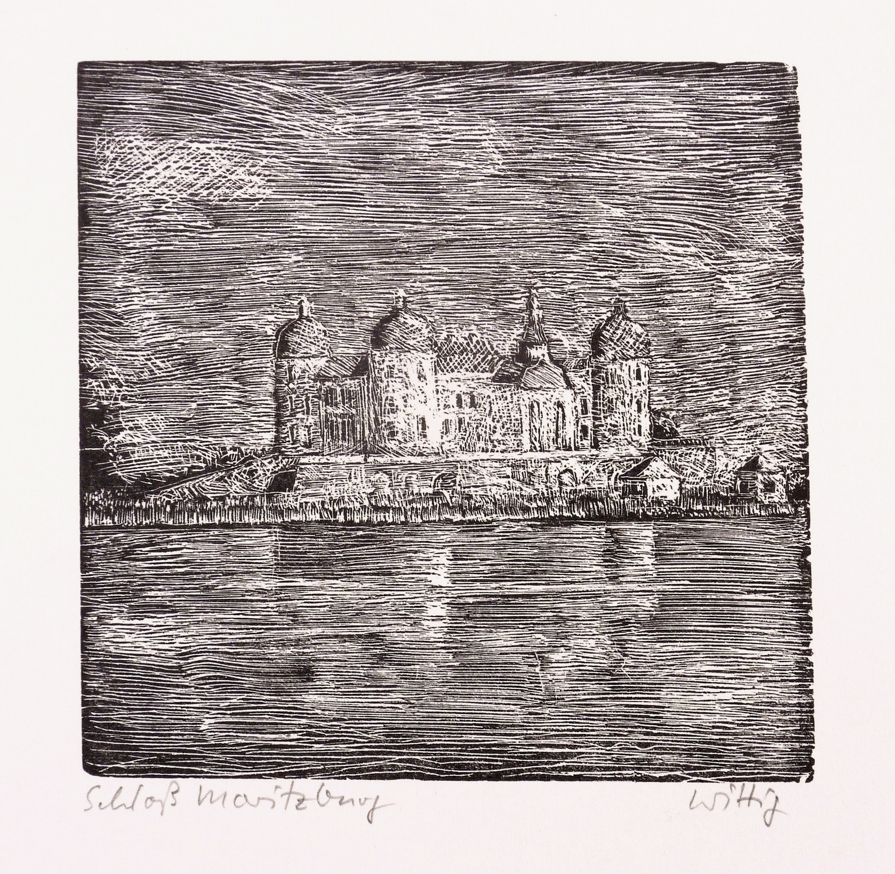 Aus: Werner Wittig, Güter und Schlösser um Dresden (Radebeul: Eigenverlag 2004). – Rechts unten in Bleistift signiert: ″Wittig″. Links Titel: ″Schloß Moritzburg″. – Nicht mehr im WVZ Reinhardt. – Sehr guter Zustand.
