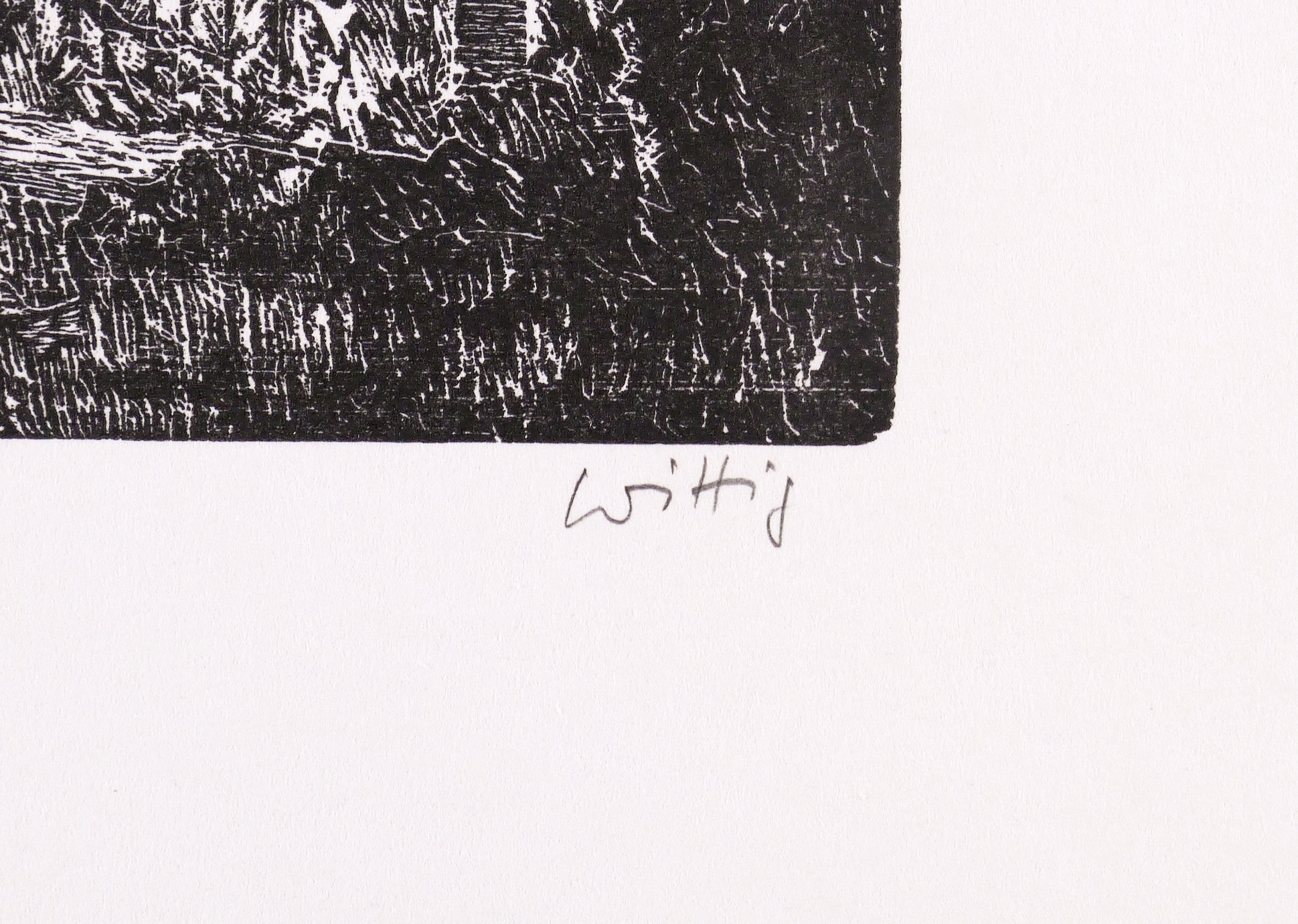 Werner Wittig (1930 Chemnitz - 2013 Radebeul). Deutscher Maler und Grafiker. 1952-57 Studium der Grafik an der HfbK Dresden bei Erich Fraaß, Hans Theo Richter und Max Schwimmer. Freundschaft mit Claus Weidensdorfer. 1957 Aufnahme in den Verband Bildender Künstler der DDR. Zahlreiche Einzelausstellungen z.B. in der Galerie Kühl in Dresden. Hans-Theo-Richter-Preis der Sächsischen Akademie der Künste in Dresden. Landschaft und Stillleben sind die zwei Hauptthemen des Künstlers, die meist mittels des Holzrisses oder Farbholzrisses umgesetzt werden. Typisch dabei sind die sichtbaren natürlichen Strukturen des Holzes, die, eingearbeitet in die Komposition, den Grafiken eine organische Lebendigkeit verleihen.