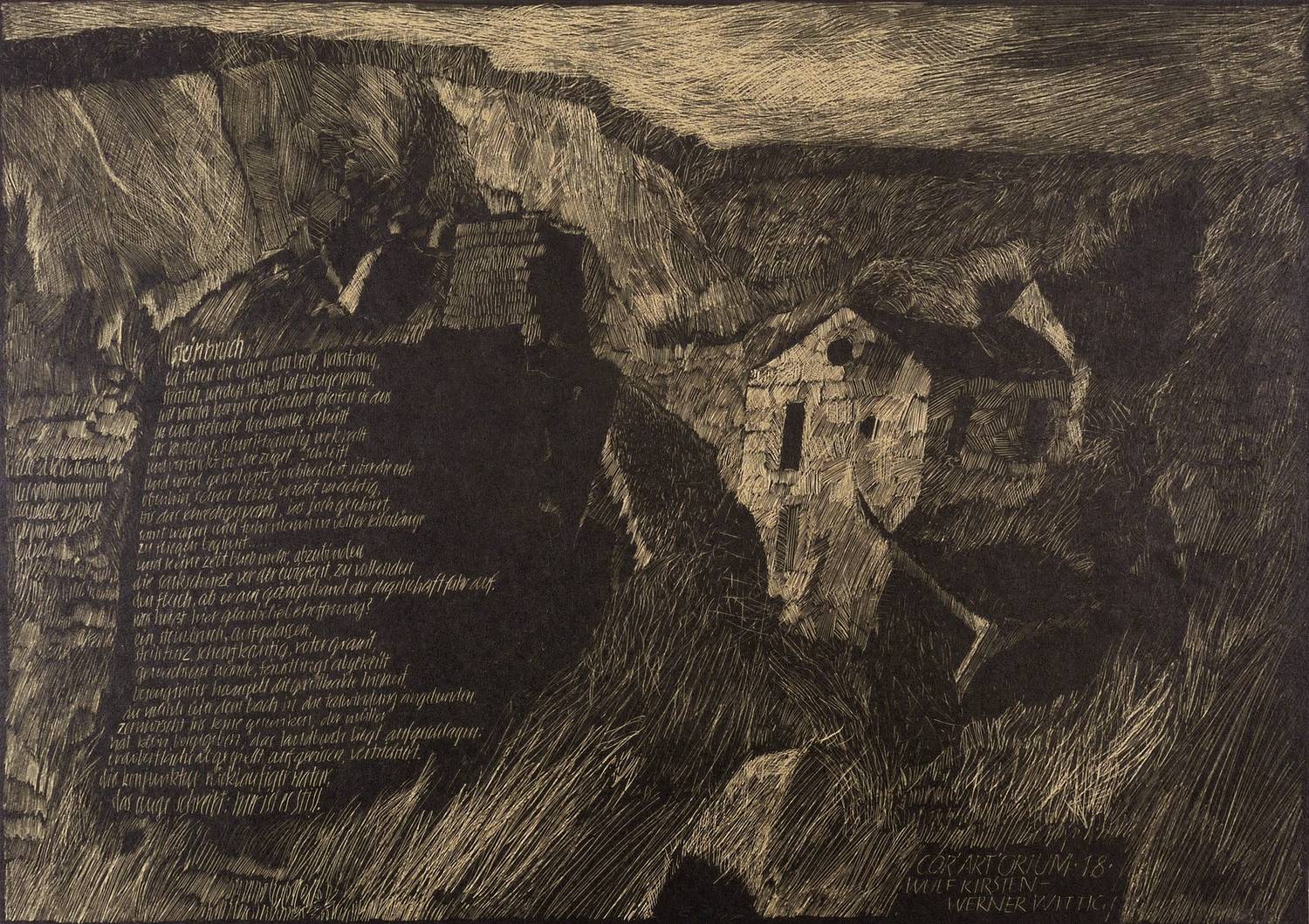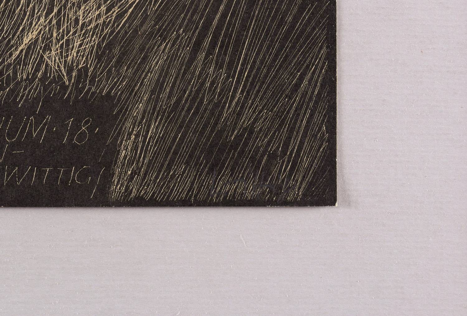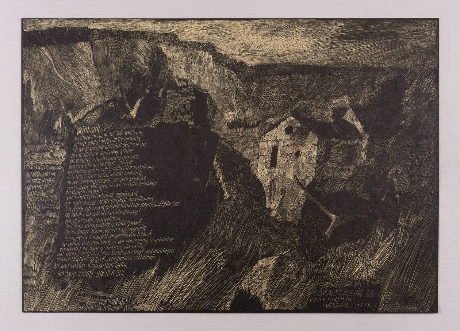 Rechts unten in Bleistift signiert: ″Wittig″. Mittig Auflagenbezeichnung: ″E.A.″ In der Darstellung Inschrift mit dem Gedicht ″Steinbruch″ von Wulf Kirsten. – Blatt Nr. 18 aus der mehrjährigen Folge ″Cor Art Orium″, erschienen ab etwa 1980 in kleinen Auflagen von 25 bis 40 Exemplaren, ab 1989 im Verlag Rütten & Loening in Auflagen von 198 Exemplaren. – Sehr guter Zustand.