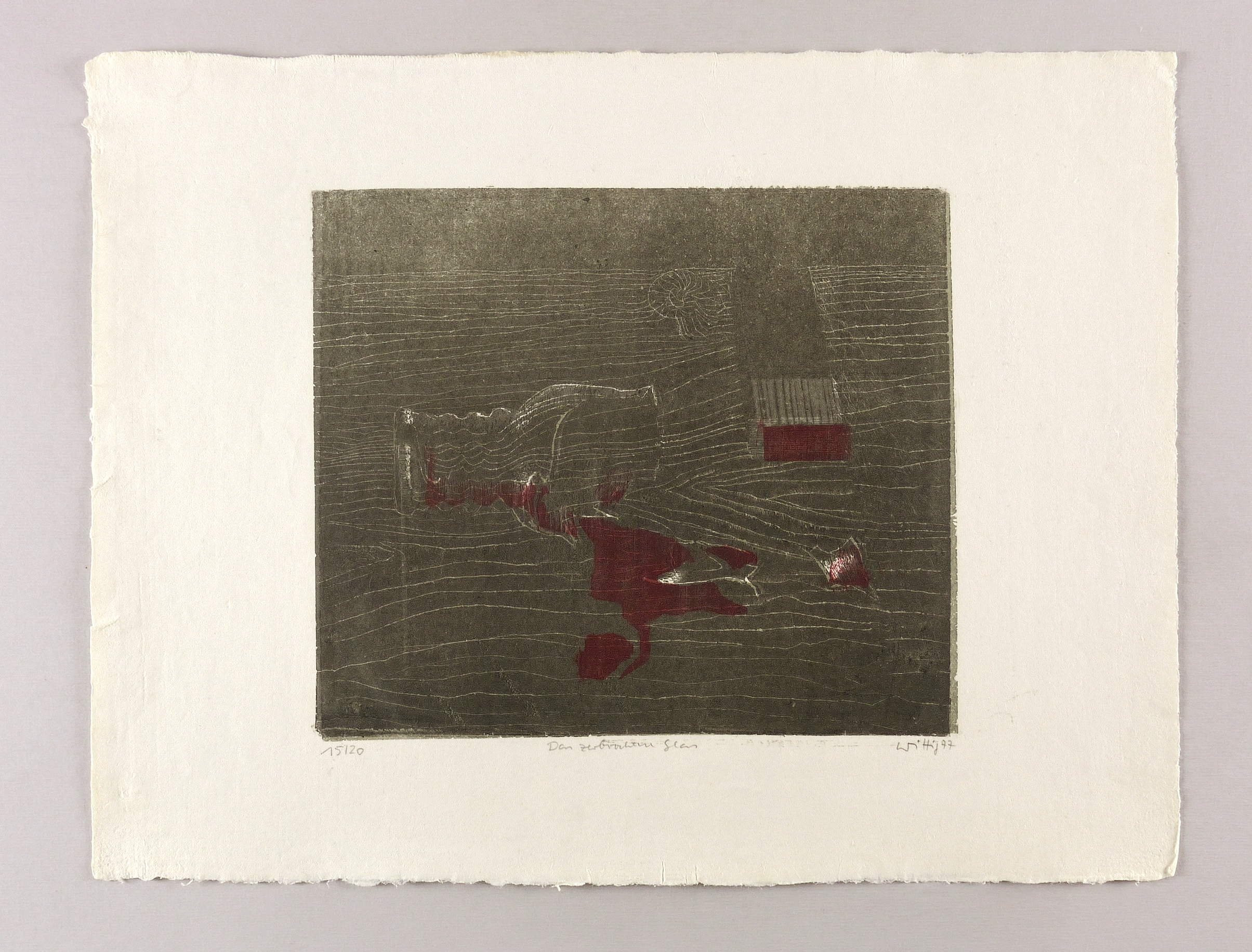 1977. Farbholzriss, in 3 Farben, von 3 Stöcken, auf rauem hellchamois Japanbütten. – Originale Künstlergrafik, von Werner Wittig. – Auflage Exemplar Nr. 15/20. – 28,0 x 32,7 cm (Darstellung / Druckbild), 43 x 56 cm (Blatt).