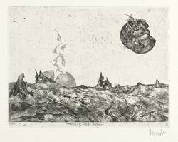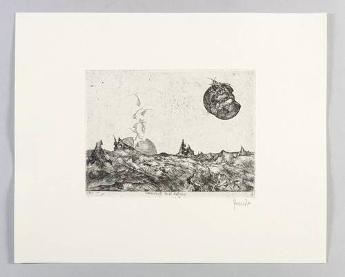 1967. Radierung / Strichätzung & Kaltnadel, in Schwarz, auf hellgelbem Velinkarton. – Originale Künstlergrafik, von Heinz Zander. – 14,9 x 19,9 cm (Darstellung / Platte), 30 x 37 cm (Blatt).