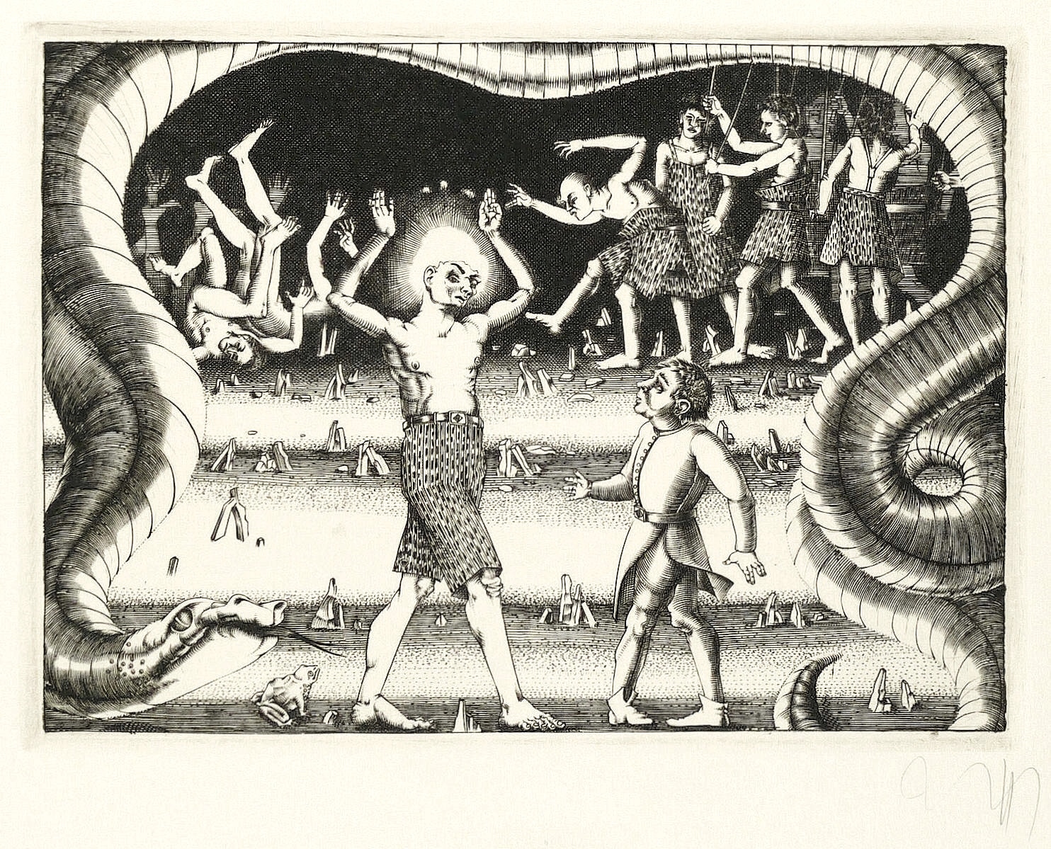 Lübbert 91/21. – Aus: Baldwin Zettl, Richard Wagner - Der Ring des Nibelungen. 22 Originalkupferstiche (Leipzig: Sisyphos-Presse 2001). – Rechts unten in Bleistift signiert. – Illustration zu Richard Wagners Oper ″Rheingold″. – Sehr guter Zustand.