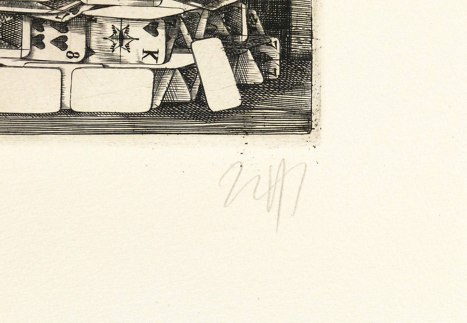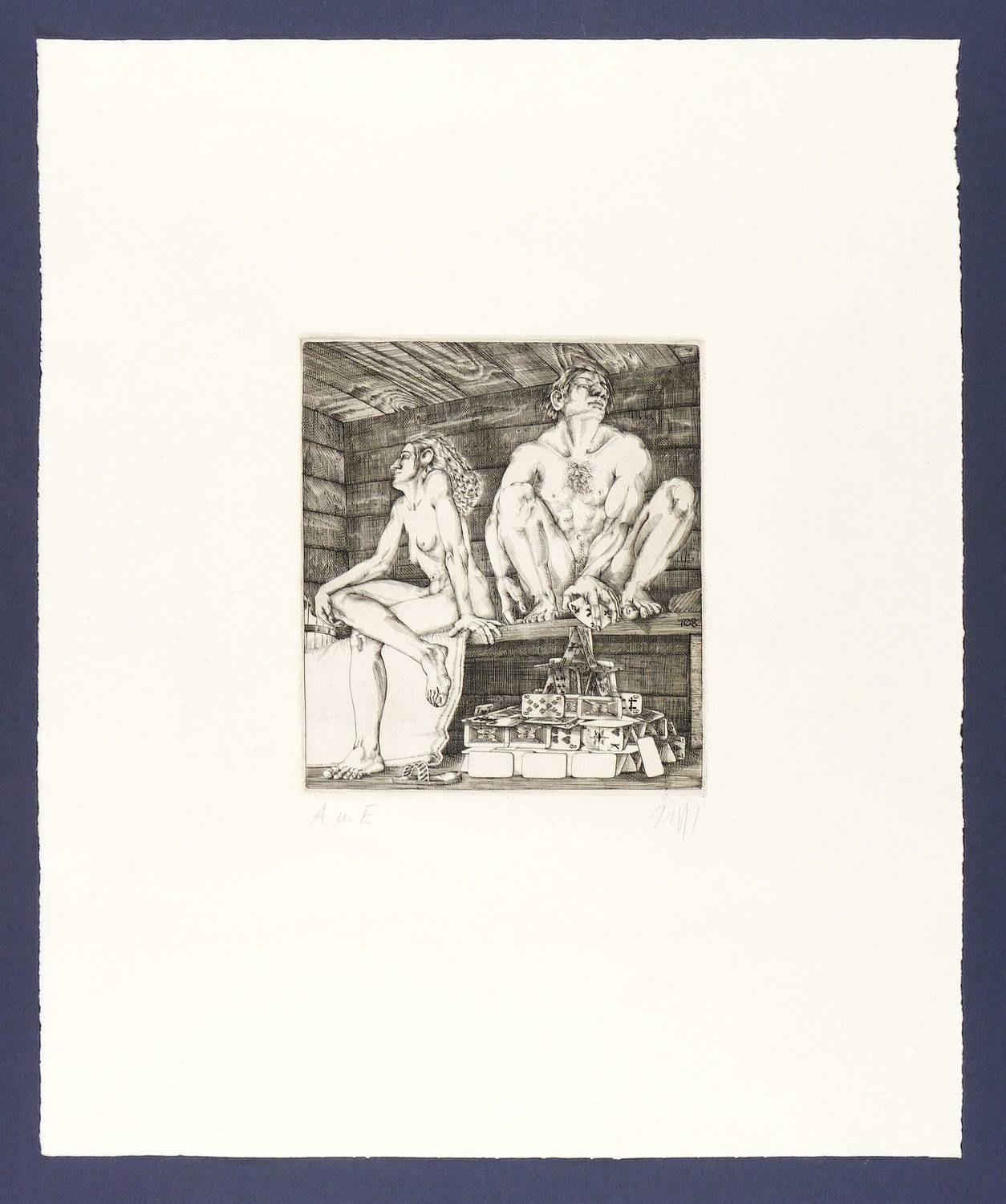 1978. Kupferstich / Linienstich, in Schwarz, auf hellgelbem Büttenpapier. – Originale Künstlergrafik, von Baldwin Zettl. – Künstlerexemplar (e.a.). – 20,9 x 18,5 cm (Darstellung), 21,5 x 19,0 cm (Platte), 52 x 43 cm (Blatt).