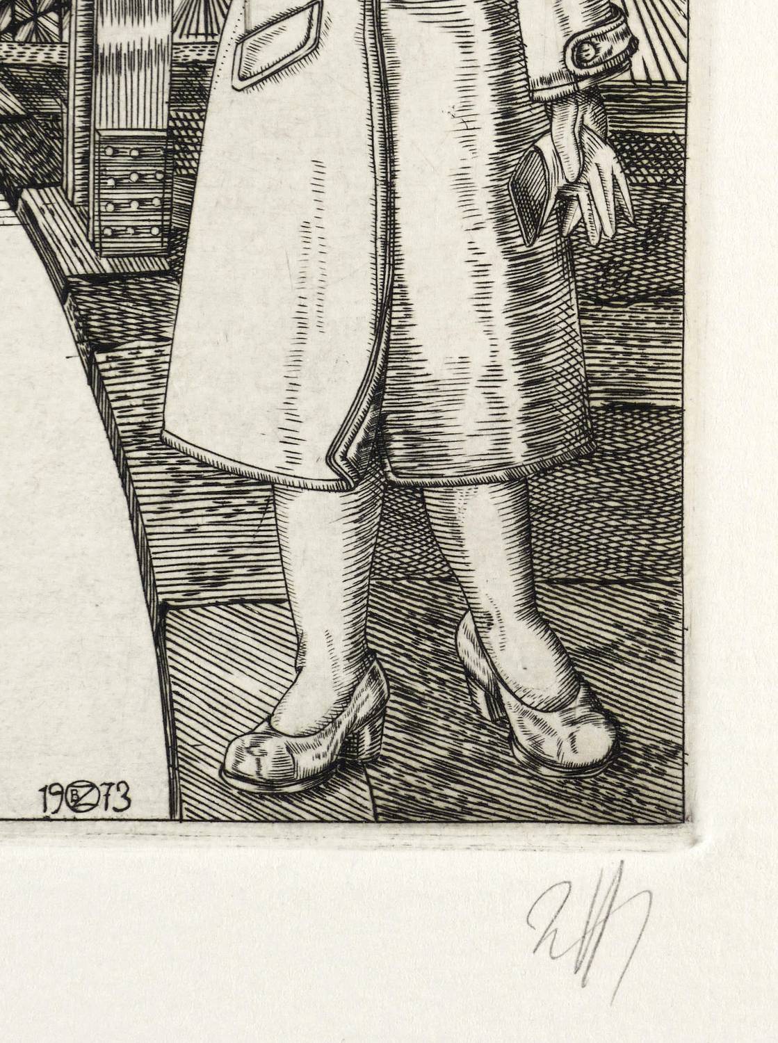 1973. Kupferstich / Linienstich, in Schwarz, auf gelbem Weißenborn-Bütten. – Von Baldwin Zettl. – Probedruck. – 16,1 x 22,6 cm (Darstellung / Einfassungslinie), 16,6 x 23,2 cm (Platte), 25,5 x 38 cm (Blatt).
