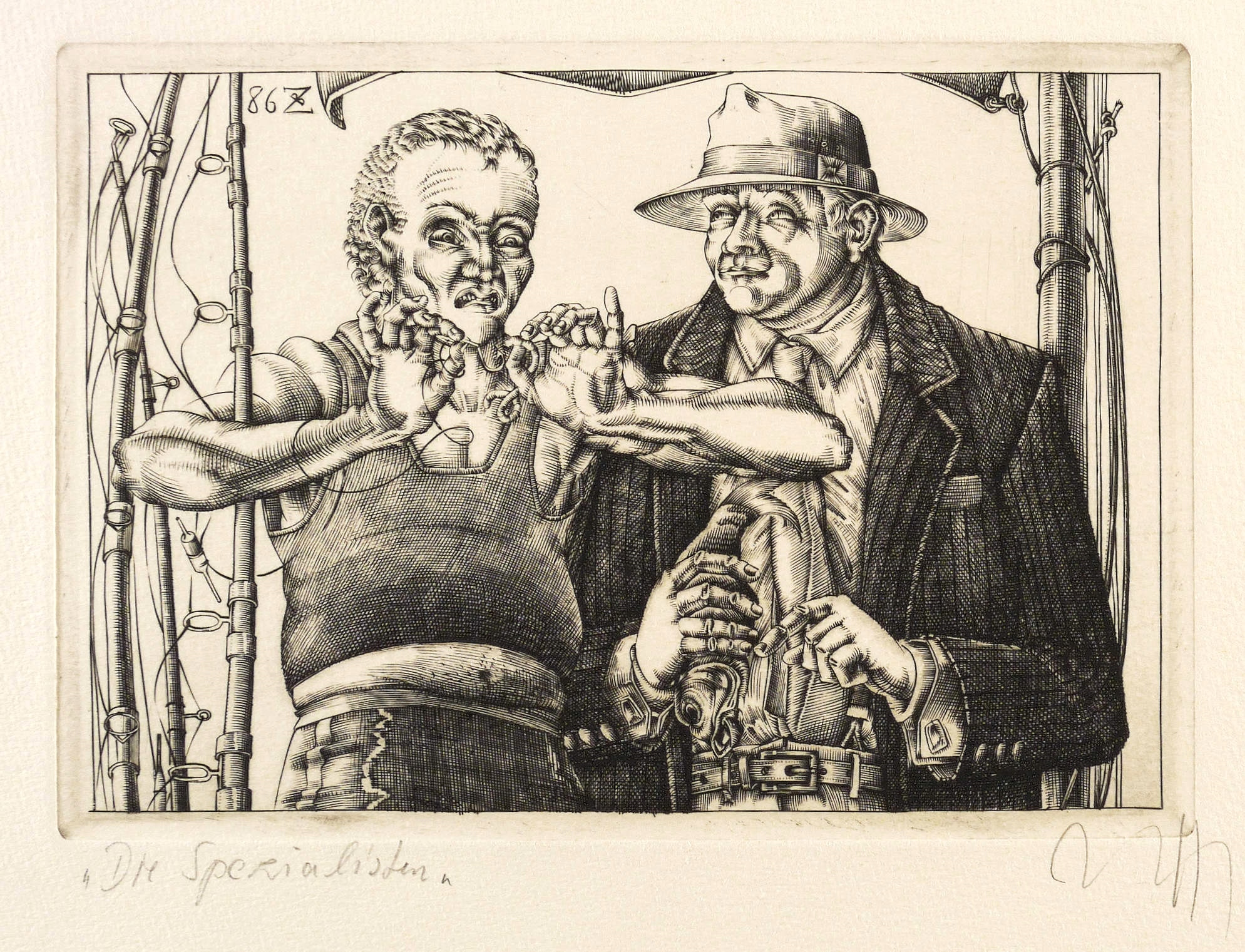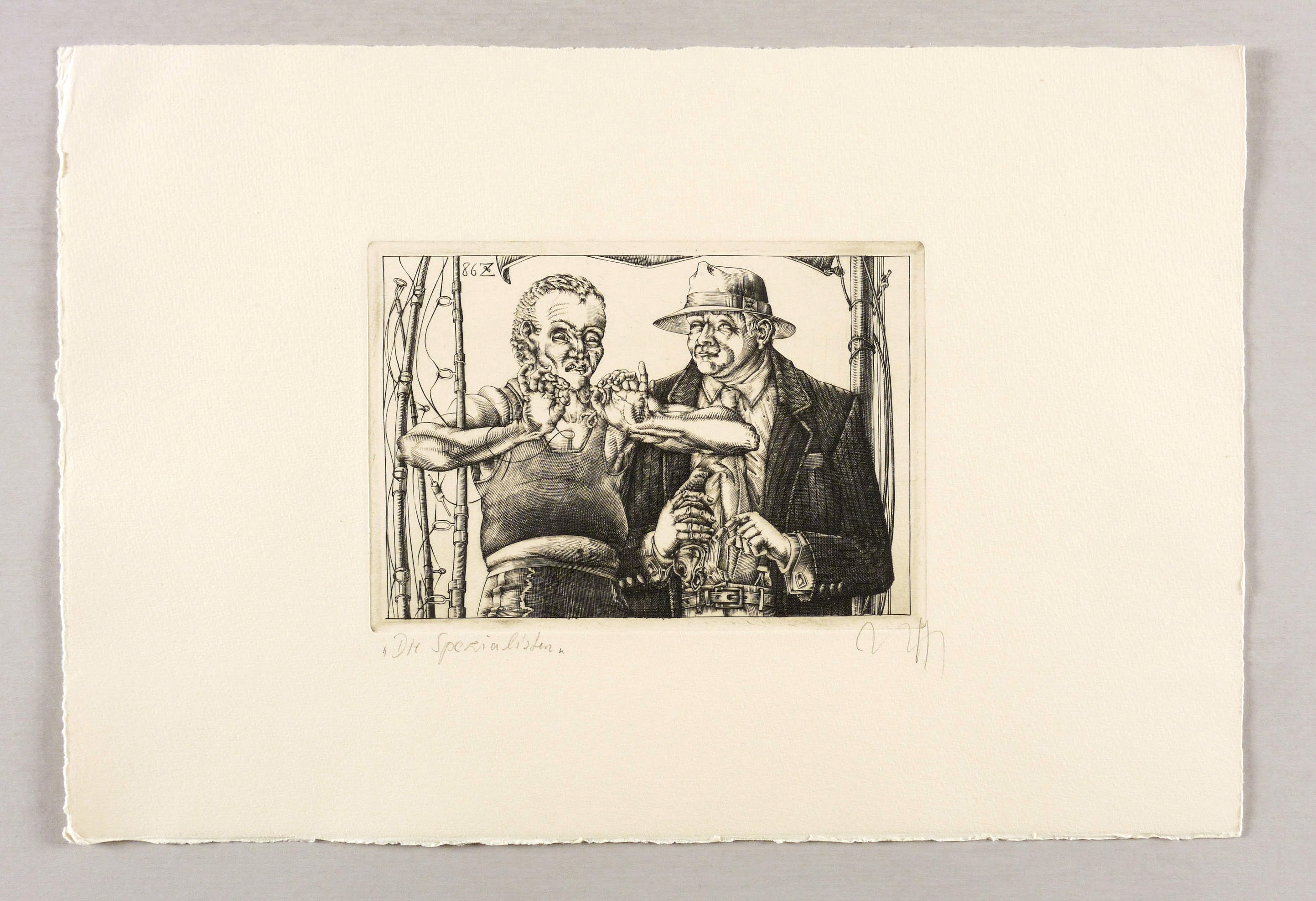 Lübbert 86/13 D. Griffelkunst 265 A5. – Rechts unten in Bleistift signiert: ″Zettl″. Links Titel: ″Die Spezialisten″. In der Platte links oben Jahr und Monogramm: ″86 BZ″. – Sehr guter Zustand.