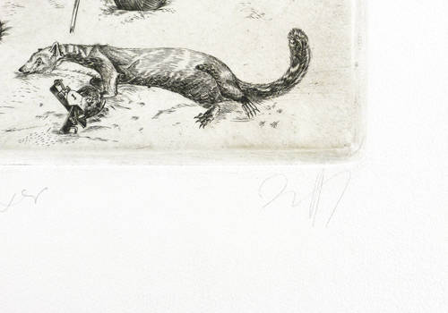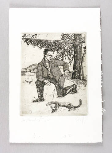 Lübbert 73/6 b (von e). – Rechts unten in Bleistift signiert: ″Zettl″. Links betitelt: ″Der Marderfänger″. Links unten Auflagenbezeichnung: ″h.c.″ – Sehr guter Zustand.