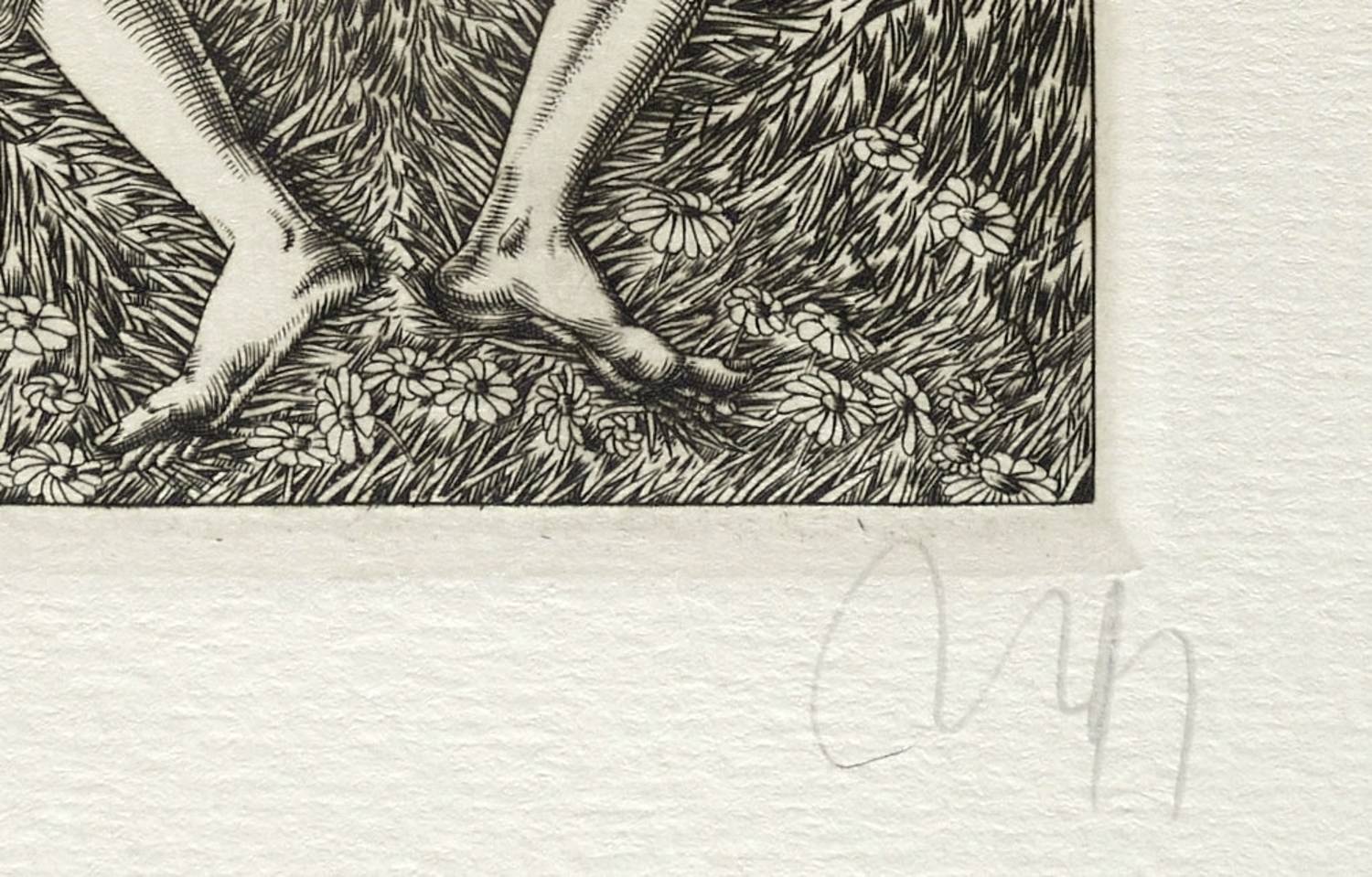 1981. Kupferstich / Linienstich, in Schwarz, auf hellgelbem Velinkarton. – Originale Künstlergrafik, von Baldwin Zettl. – 10,7 x 7,5 cm (Darstellung / Einfassungslinie), 11,3 x 8,2 cm (Platte), 28 x 25 cm (Blatt).