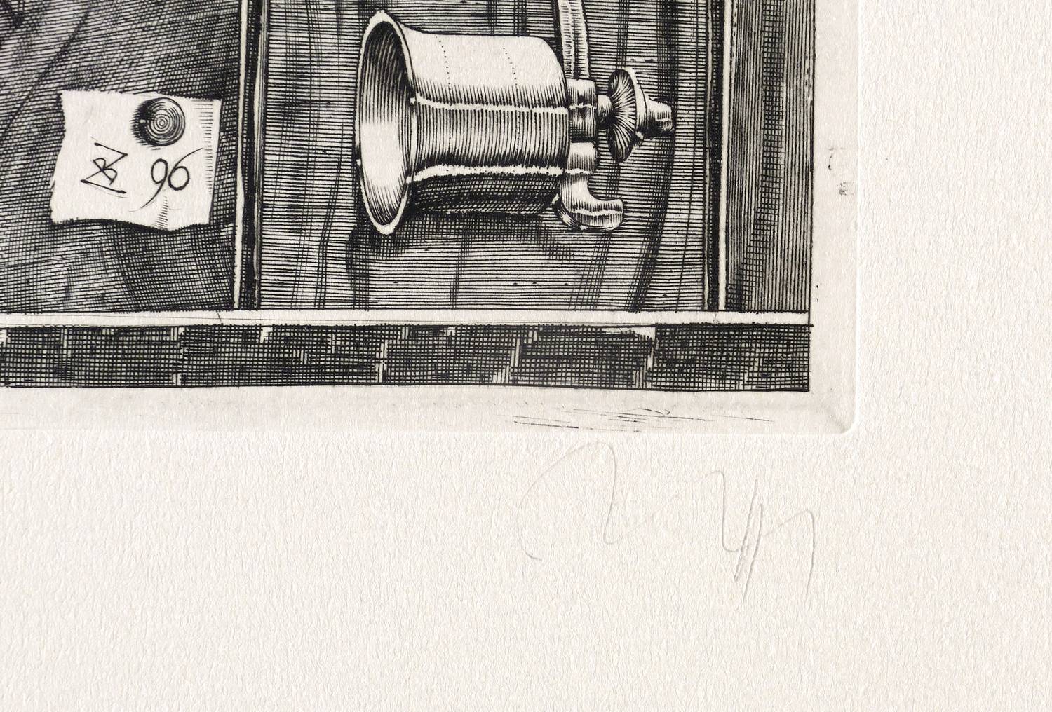 1996. Kupferstich / Linienstich, in Schwarz, auf hellgelbem Velinkarton. – Originale Künstlergrafik, von Baldwin Zettl. – 20,8 x 14,7 cm (Darstellung / Einfassungslinie), 21,7 x 15,7 cm (Platte), 34 x 24 cm (Blatt).