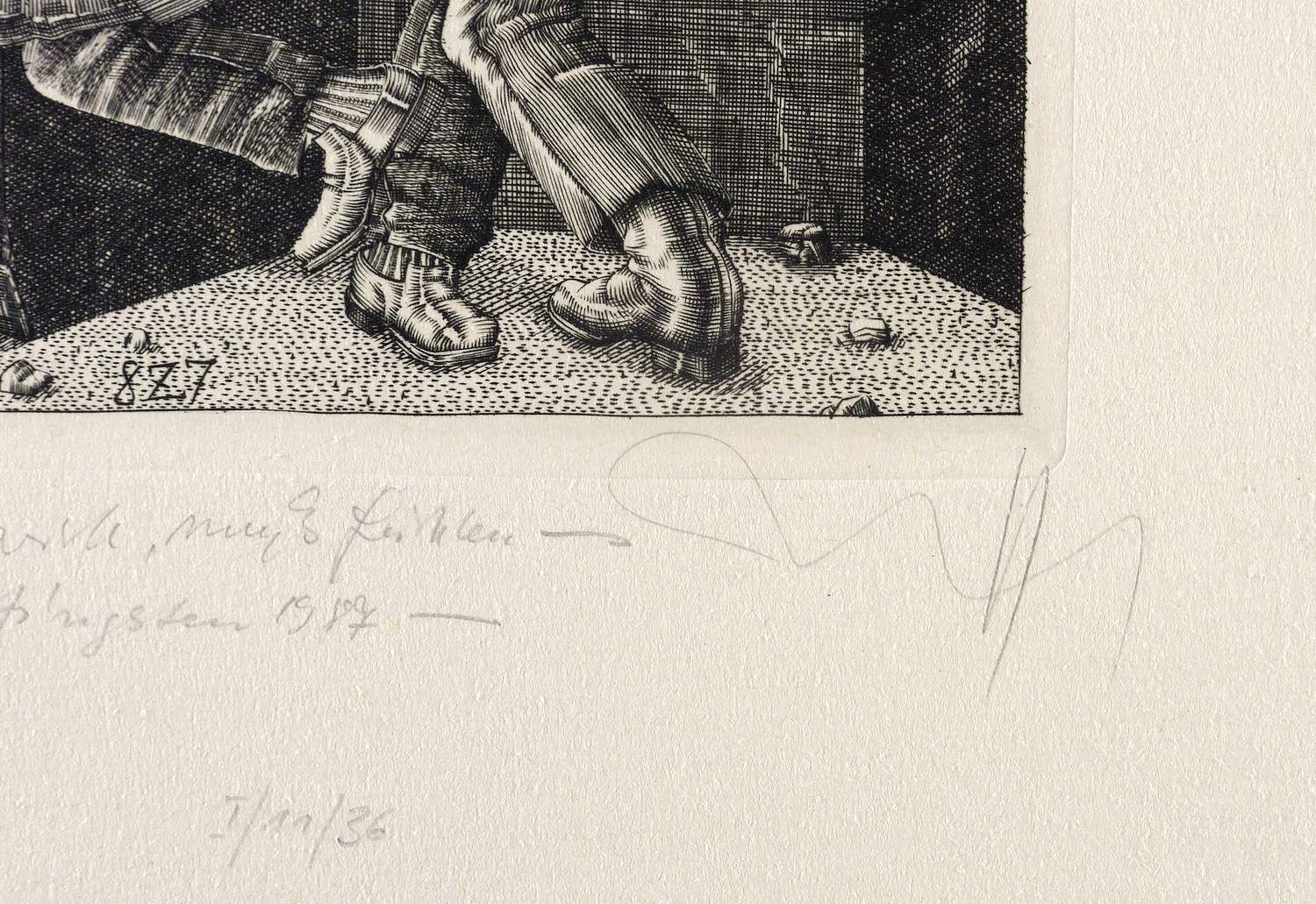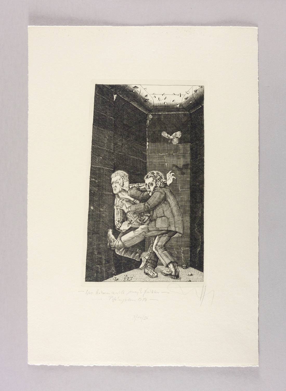 1987. Kupferstich / Linienstich, in Schwarz, auf weichem chamois Velinkarton. – Originale Künstlergrafik, von Baldwin Zettl. – Auflage Exemplar Nr. 11/36. – 22,7 x 13,8 cm (Darstellung / Einfassungslinie), 24,0 x 14,8 cm (Platte), 40 x 27 cm (Blatt).