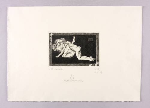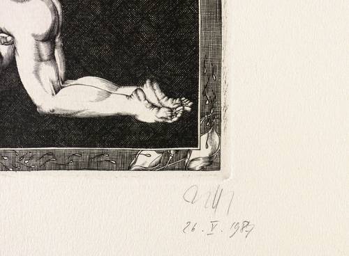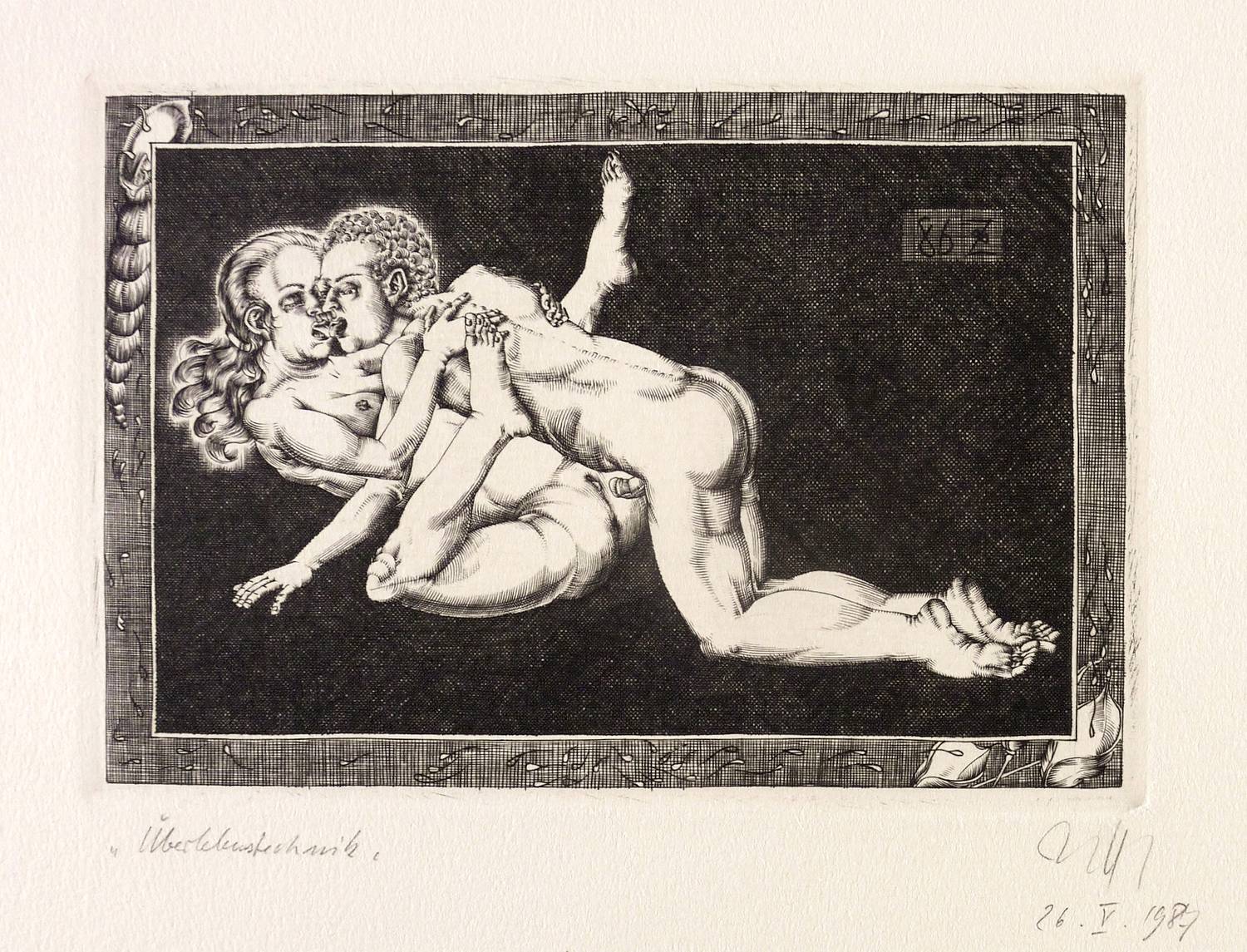 1986/1987. Kupferstich / Linienstich, in Schwarz, auf schwerem chamois Velin. – Originale Künstlergrafik, von Baldwin Zettl. – Künstlerexemplar (h.c.) Nr. XII/XII. – 12,0 x 17,5 cm (Darstellung), 12,6 x 18,4 cm (Platte), 34 x 48 cm (Blatt).