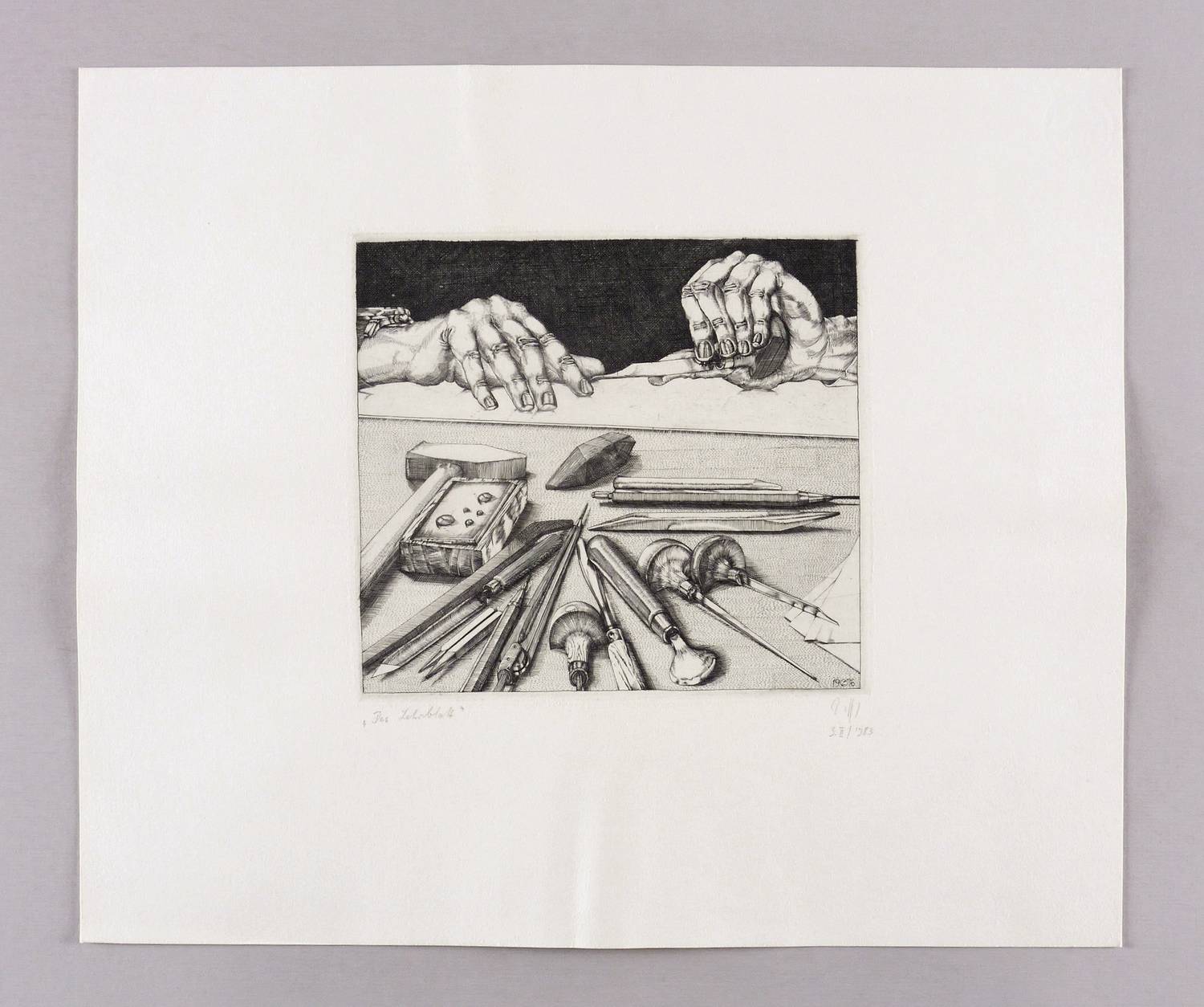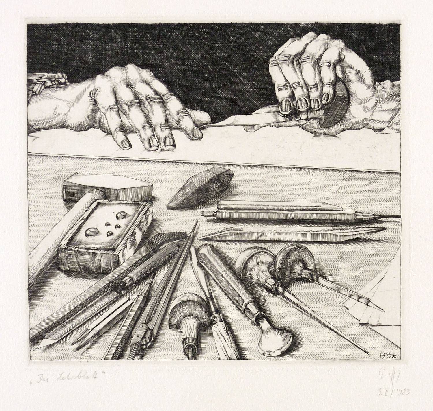 Lübbert 76/2. – Rechts unten in Bleistift signiert: ″Zettl″. Links Titel: ″Das Lehrblatt″. In der Platte rechts unten Monogramm und Jahr: ″19 BZ 76″. – Sehr guter Zustand.