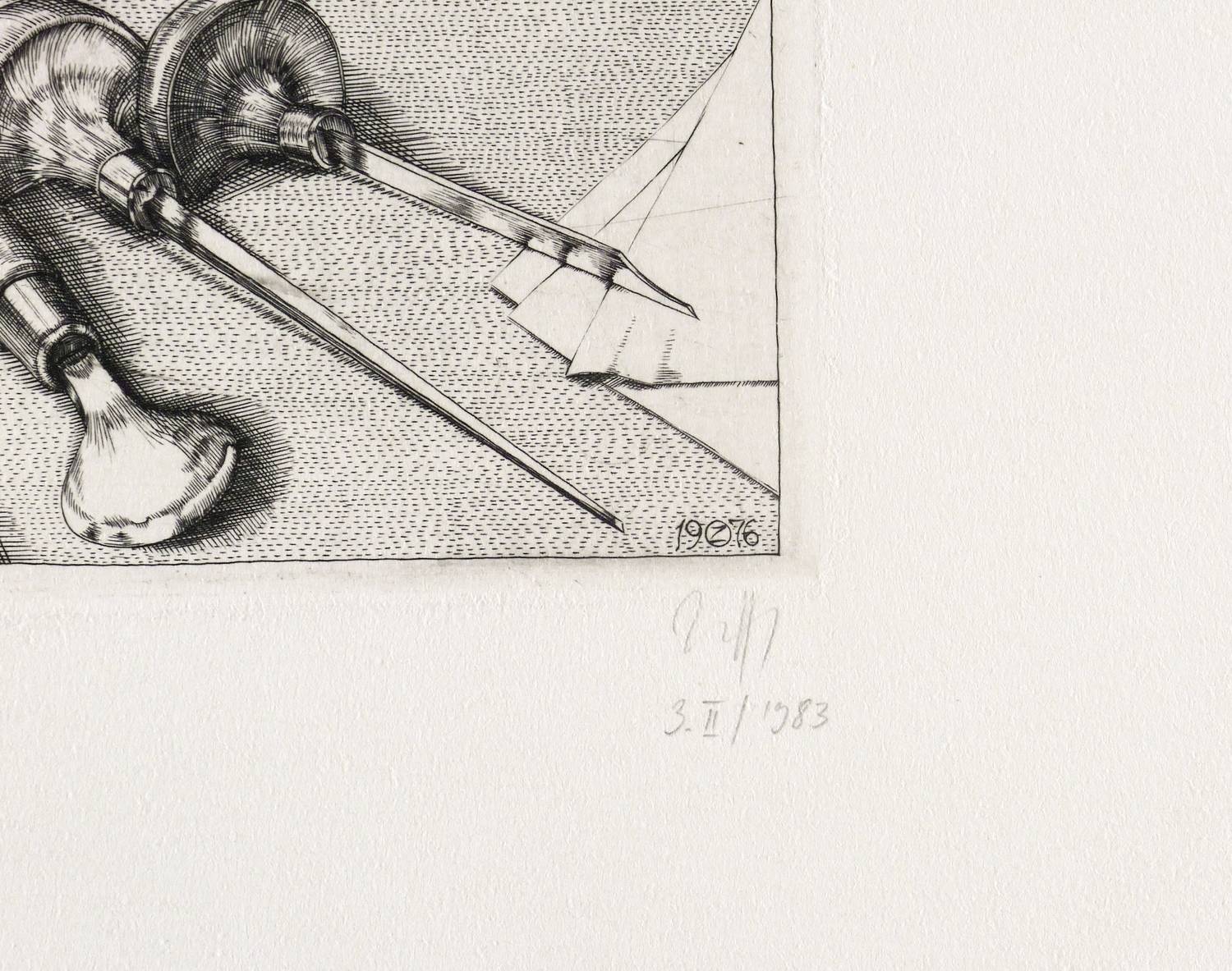 1976/1983. Kupferstich / Linienstich, in Schwarz, auf hellchamois Velin. – Originale Künstlergrafik, von Baldwin Zettl. – 19,1 x 21,1 cm (Darstellung / Einfassungslinie), 38 x 44 cm (Blatt).